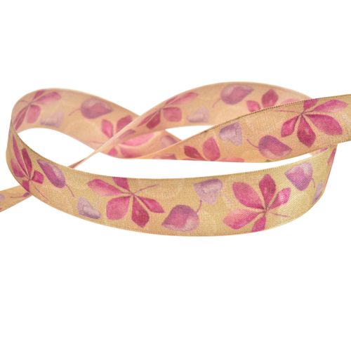Darčeková stuha zo 100% polyesteru béžovej farby s fialovým jesenným lístím vám dodávame na cievke vyrobenej z recyklovaného plastu. Je asi 25 milimetrov široký a asi 20 metrov dlhý.