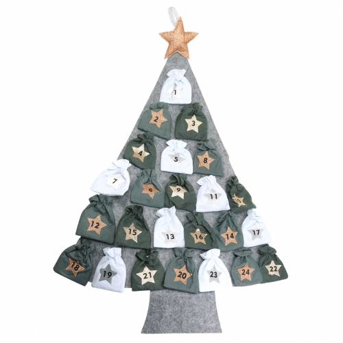 Na vrchole jedle je trblietavá bronzová hviezda. Krásny adventný kalendár, ktorý je vybavený praktickým závesným popruhom, sa dá jednoducho zavesiť na háčik alebo klinec. Či už na dvere, ako dekorácia na stenu alebo na okno, vianočný kalendár s vrecúškom nielen skráti čakanie na Štedrý večer, ale je aj atraktívnym dekoračným prvkom v predvianočnom období. Vďaka svojmu jemnému, ale slávnostnému vzhľadu sa plstený adventný kalendár hodí k širokej škále štýlov zariadenia.