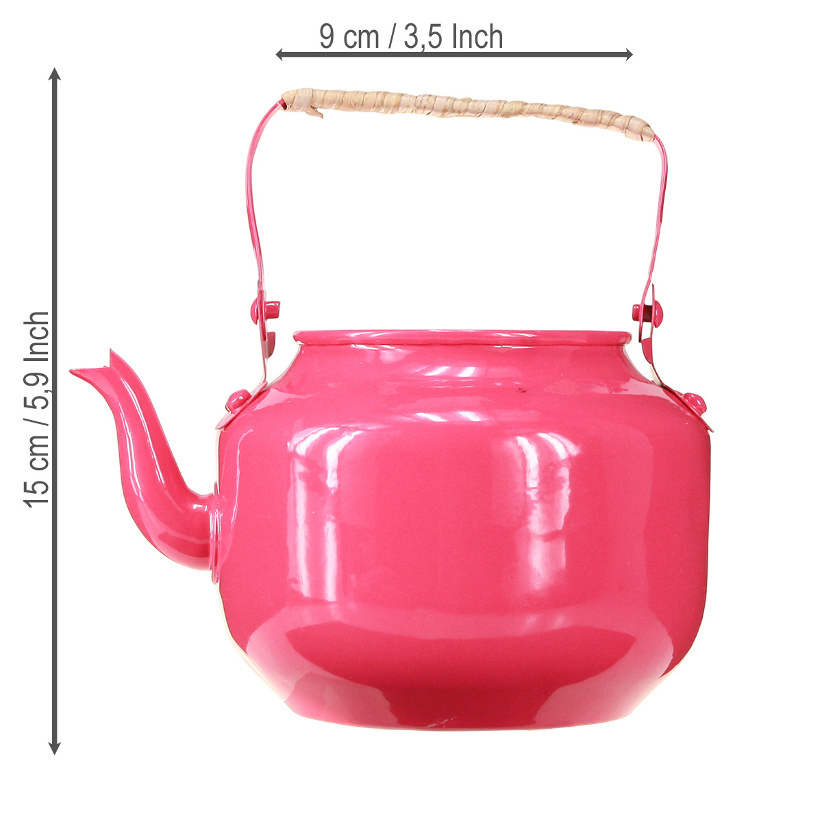 Prečo práve táto kanvica na čaj? Vďaka svojej praktickej veľkosti s výškou 15 cm a priemerom 11 cm je všestranným predmetom, ktorý slúži na dekoratívny aj praktický účel. Ružová farba je svieža a veselá, no zároveň dostatočne klasická, aby nebola príliš výrazná. Robustný kovový materiál zaručuje odolnosť a stabilitu, zatiaľ čo rustikálna rukoväť s bambusovými detailmi dokonale dopĺňa vidiecky štýl.