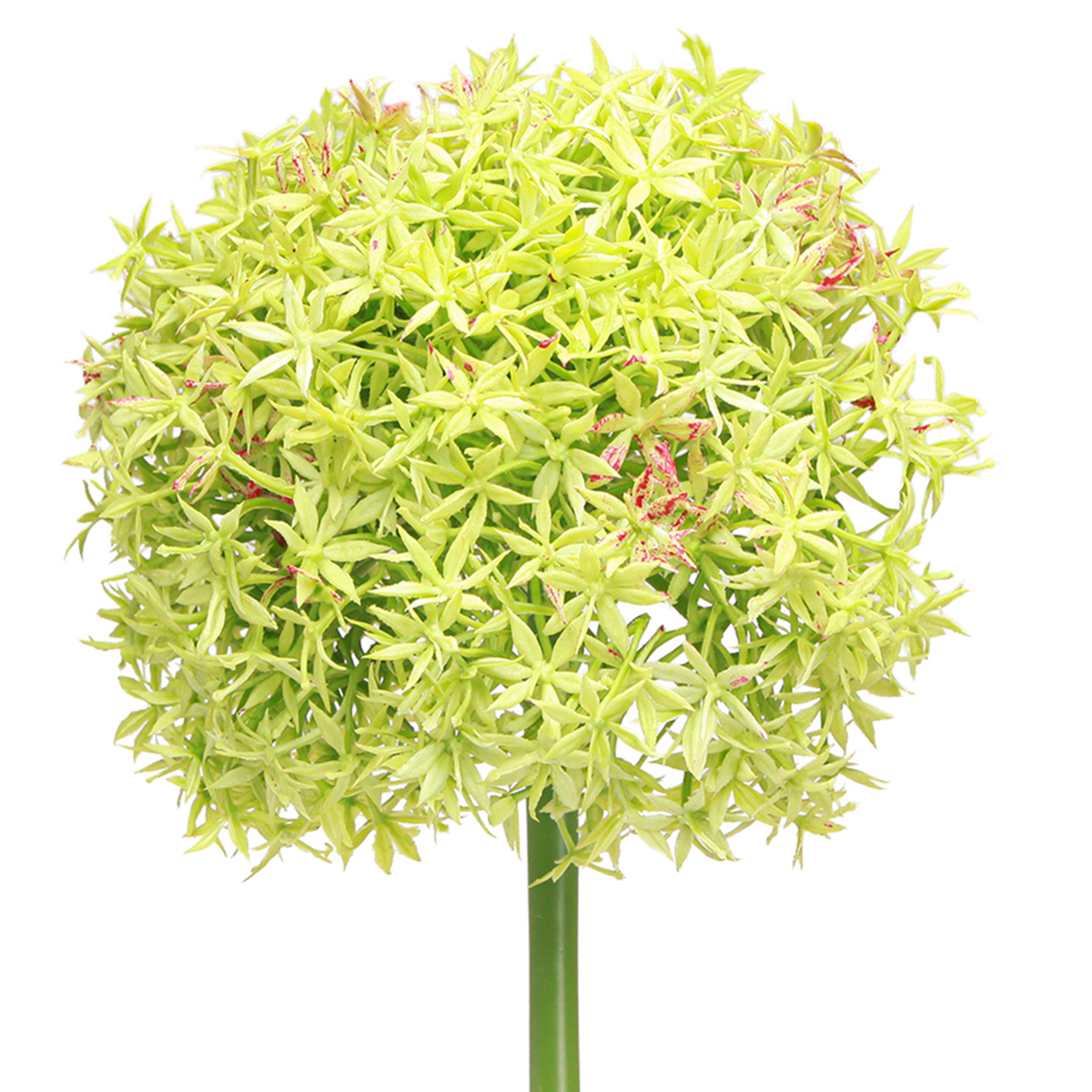 Objavte fascinujúci svet Allium , tiež známy ako okrasná cibuľa, v umelo navrhnutej umelej verzii. Naše allium so zelenými kvetmi a priemerom okolo 18 cm ponúka vynikajúci spôsob, ako kreatívne a nenáročne vyzdobiť vaše obytné alebo vonkajšie priestory. Na mnohých okvetných lístkoch v tvare hviezdy okrúhleho pupka sa občas objavia červené škvrny. Pevná rukoväť s kovovým jadrom pokrytá zeleným plastom zaisťuje stabilitu a flexibilitu, ako aj realistický vzhľad. Táto umelá rastlina je ideálna na letnú dekoráciu alebo ako jarný akcent do vašich izieb. Či už v obývačke, kancelárii alebo ako pútač v záhrade – táto veľká umelá okrasná cibuľa vždy upúta.