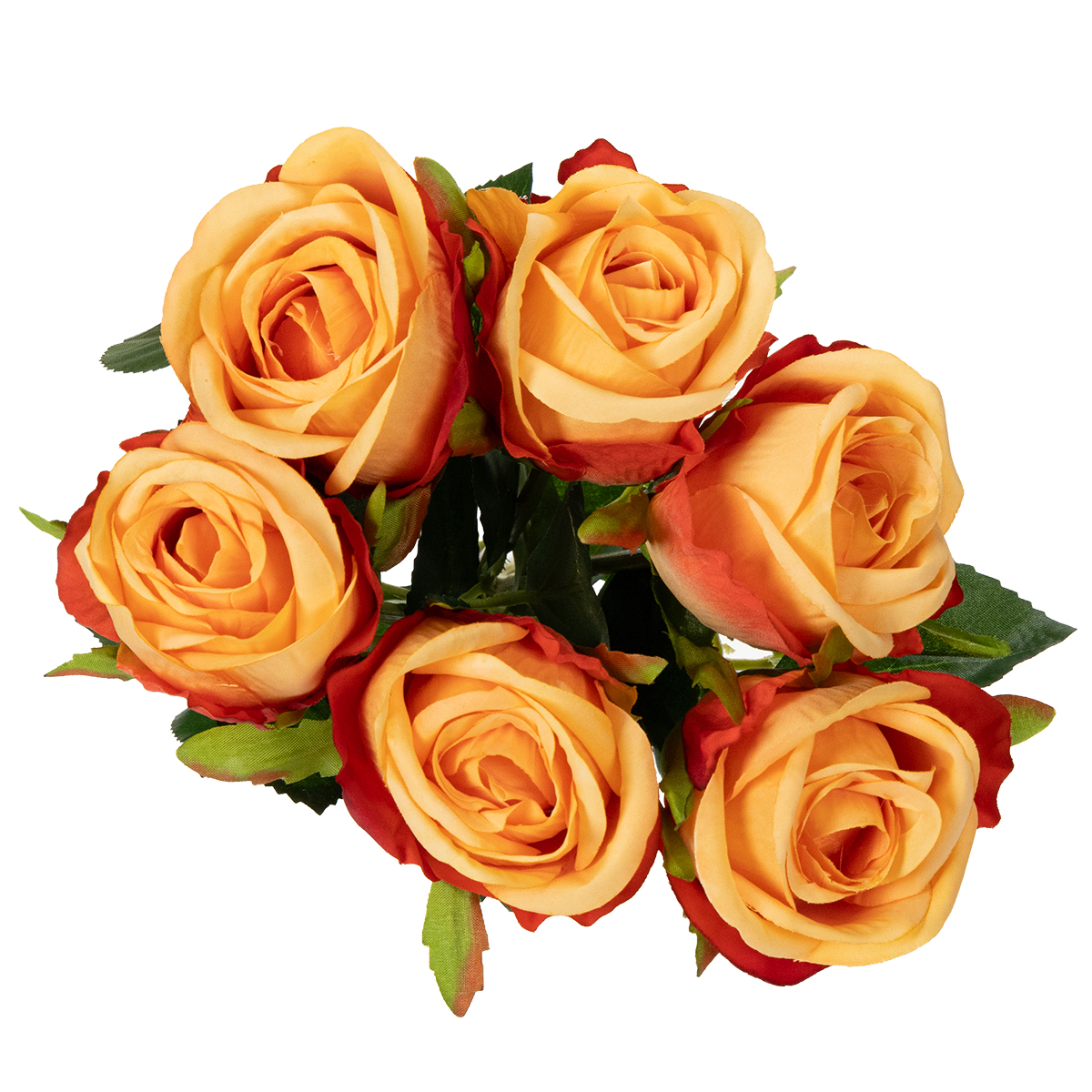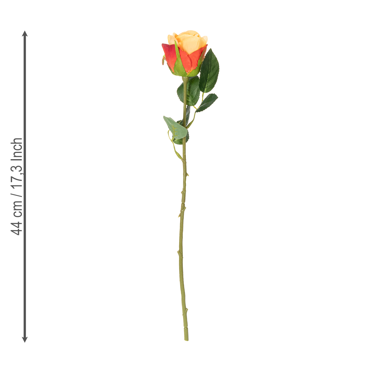 Táto umelá ružová kytica so šiestimi pomarančovými kvetmi je skutočne všestranným doplnkom do sveta bytových dekorácií. S výškou 44 cm vyzerá obzvlášť elegantne vo vysokých vázach. Dôkladné remeselné spracovanie s použitím vysoko kvalitného polyesteru a plastu dodáva ružiam prirodzený vzhľad, ktorý presvedčí aj zblízka. Teplé oranžové odtiene kvetov prinášajú do vašich izieb ľahkosť a jas, zatiaľ čo zelené listy dodávajú nádych prírody. Či už chcete osviežiť zariadenie svojej obývačky alebo hľadáte štýlový doplnok k jedálenskému stolu – táto kytica je perfektnou voľbou.