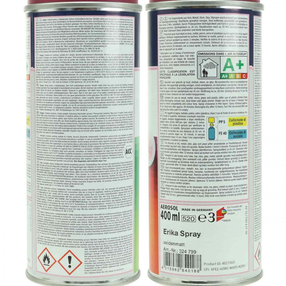Farebný sprej vo farbe Erika rýchlo schne, dobre kryje a je vhodný na vnútorné aj vonkajšie použitie. Farebný sprej je ideálnou voľbou pre povrchy a predmety vyrobené z kovu, skla, polystyrénu a plastu. Pred aplikáciou farby v spreji je potrebné povrch dôkladne očistiť, v prípade potreby prebrúsiť a ošetriť vhodným špeciálnym základným náterom. Potom sprej 2 minúty pretrepte a nastriekajte na hodvábne matnú farbu rovnomerne v dvoch až troch krížových vrstvách zo vzdialenosti asi 25 centimetrov. Farba je prachovo suchá už po 20 minútach, úplne suchá po 12 hodinách a je možné ju kedykoľvek pretrieť inými farbami Belton.