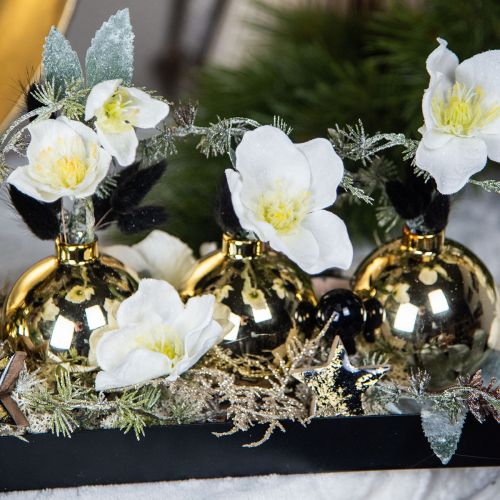 Tak dostanete krásne umelé kvety na Vianoce aj ako zimnú dekoráciu! Kvety a listy bielych vianočných ruží sú pokryté trblietkami. Zdá sa, že na bielej vianočnej ruži je aj náznak ľadu. Dokonca aj stonka a listy majú okrem trblietavého vzhľadu jemný biely lesk.