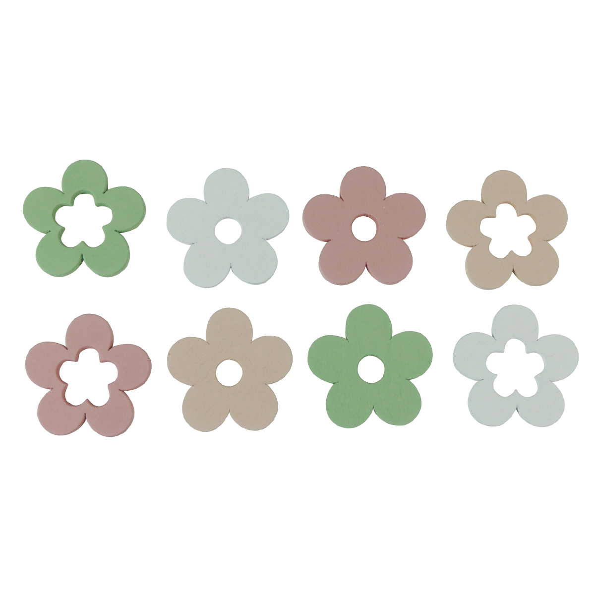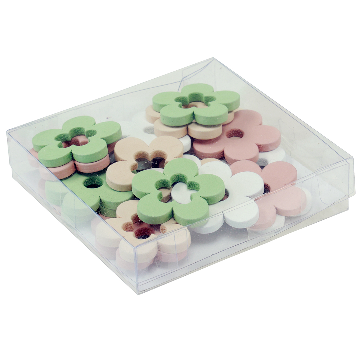 Drevené kvietky dostanete ako rozptylovú dekoráciu v balení po 24 ks vo farbách biela, ružová, zelená a žltá.