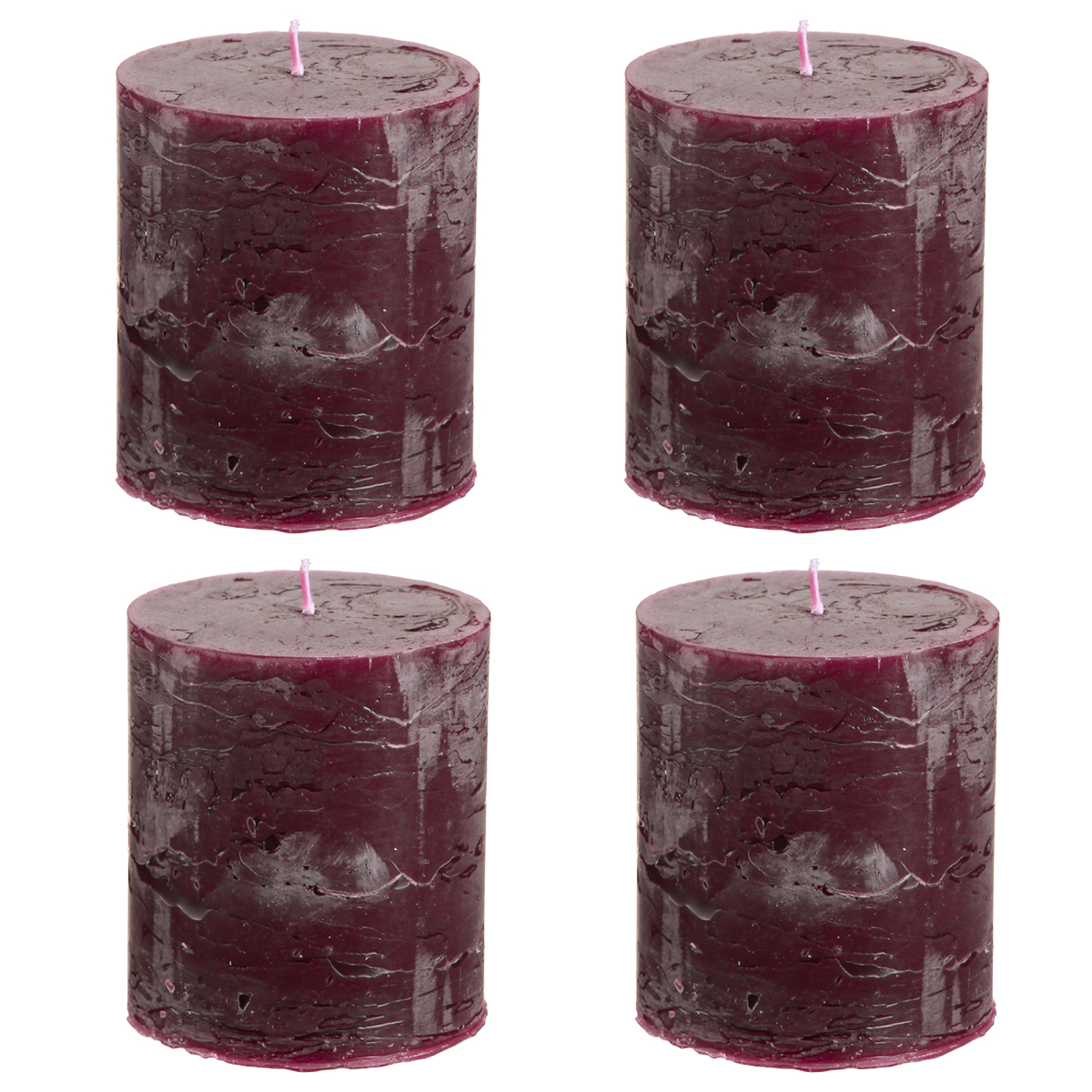 Bordové stĺpové sviečky, 70x80 mm, balenie 4 kusov, pre elegantnú dekoráciu a dlhú dobu horenia.