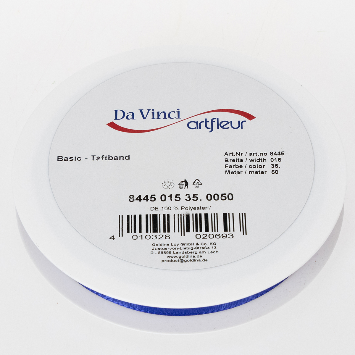 Pekná darčeková a dekoračná stuha v tmavomodrej farbe je asi 15 milimetrov široká a približne 50 metrov dlhá. Je vyrobený zo 100% polyesteru a prichádza k vám na šikovnej, plochej plastovej cievke.
