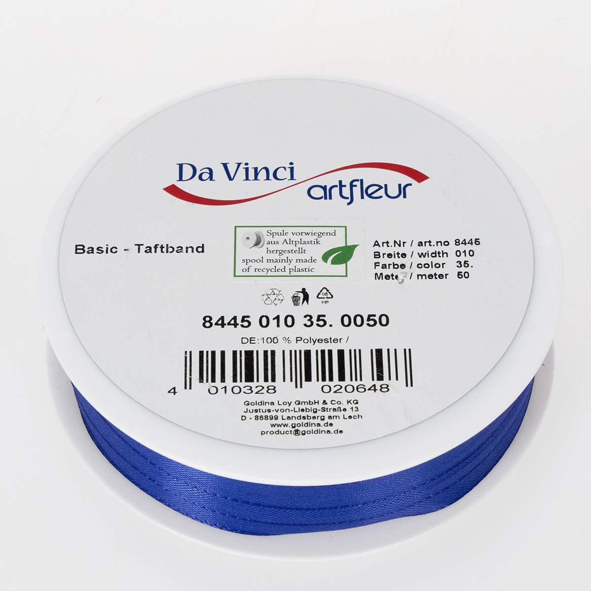 Darčeková a dekoračná stuha v tmavomodrej farbe má šírku 10 milimetrov a dĺžku približne 50 metrov.
