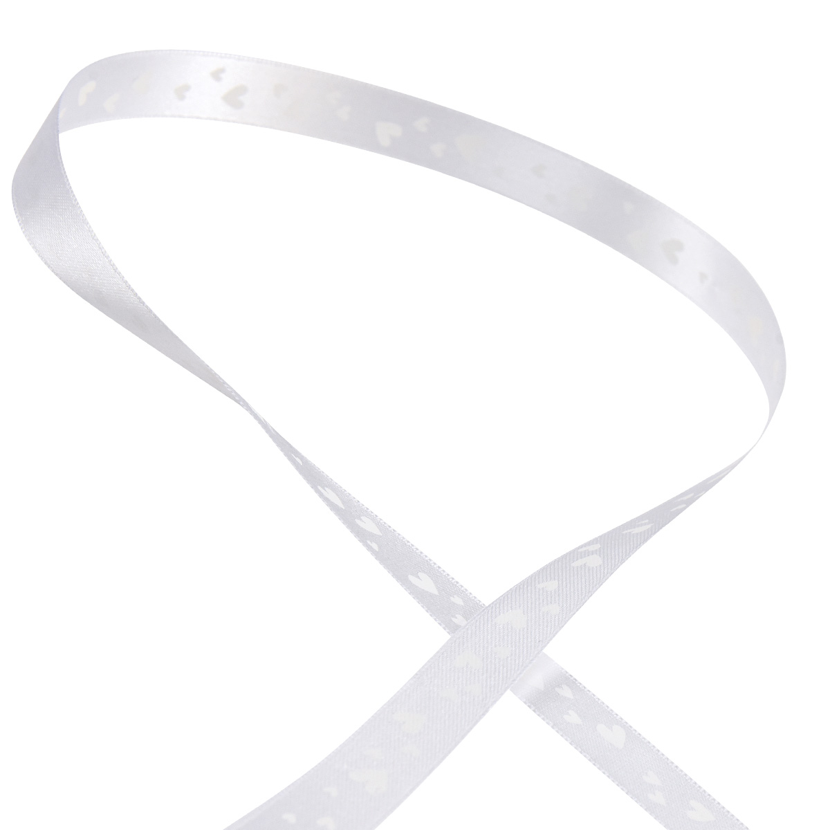 Polyesterová stuha sa leskne hodvábne bielou a je romanticky potlačená bielymi srdiečkami. Zrezané okraje dotvárajú ozdobnú stuhu a dodávajú jej dodatočnú stabilitu.