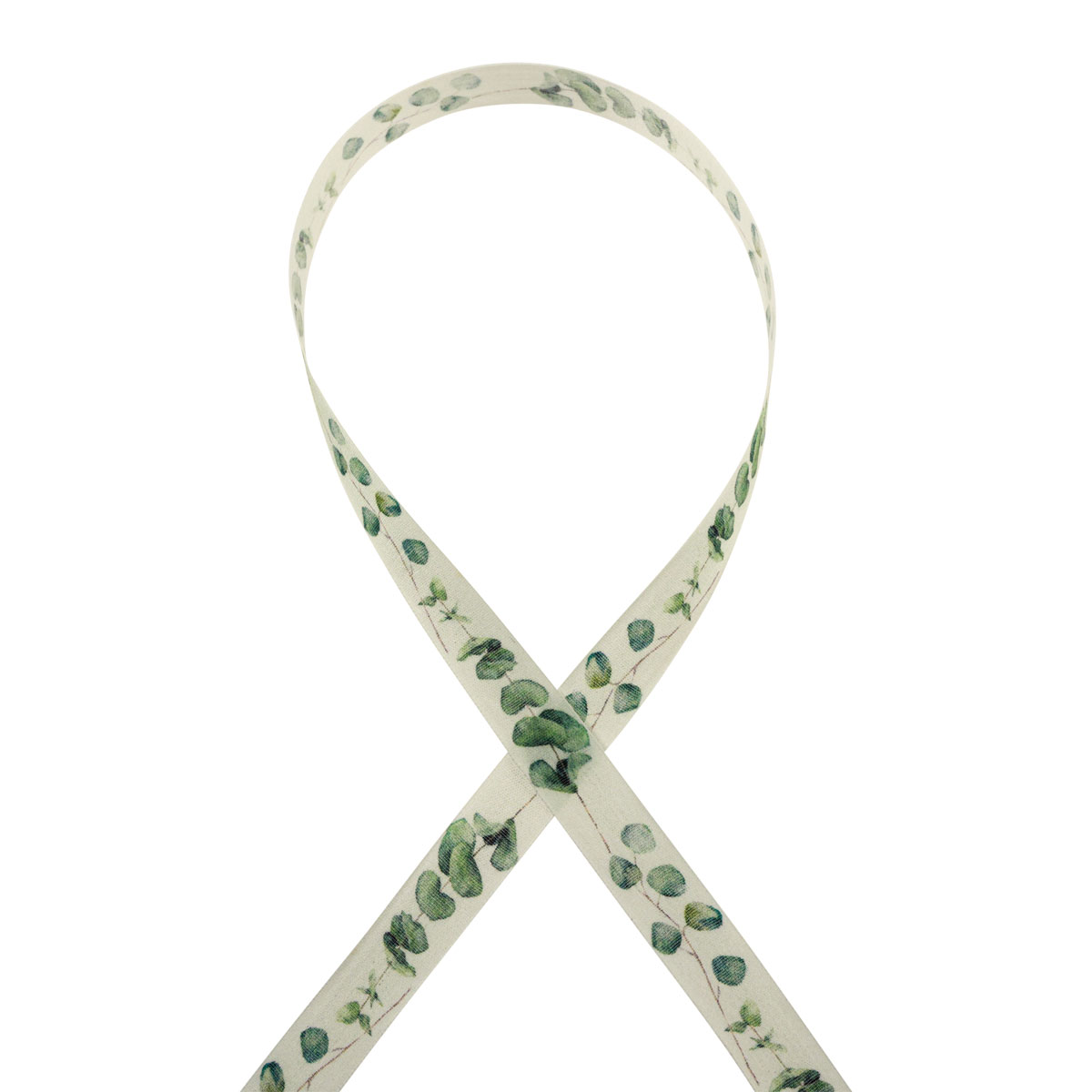 Motív na darčekovej stuhe zobrazuje konáre eukalyptu na jemnom zelenom podklade. Potlačené listy eukalyptu pripomínajú kresbu akvarelom a pôsobia veľmi nadčasovo. Zadná strana textilného pásu zostáva biela.