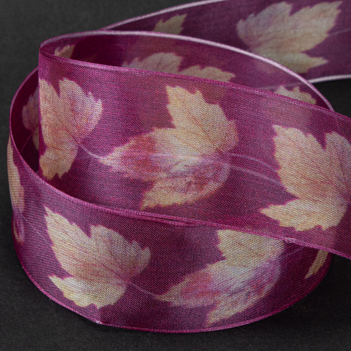Farba orgovánovej darčekovej stuhy je bordová, rozhodne však zaujme výrazný tón, hodvábny lesk a mierna priehľadnosť stuhy. Svetložlté listy na stuhe majú tiež fialové žilky.