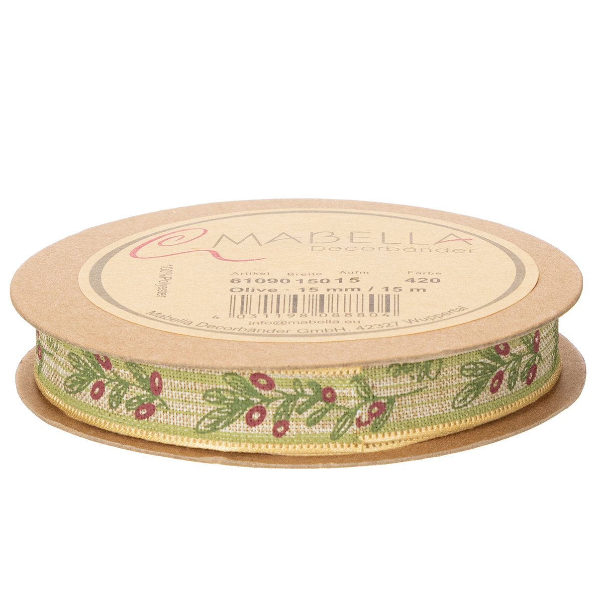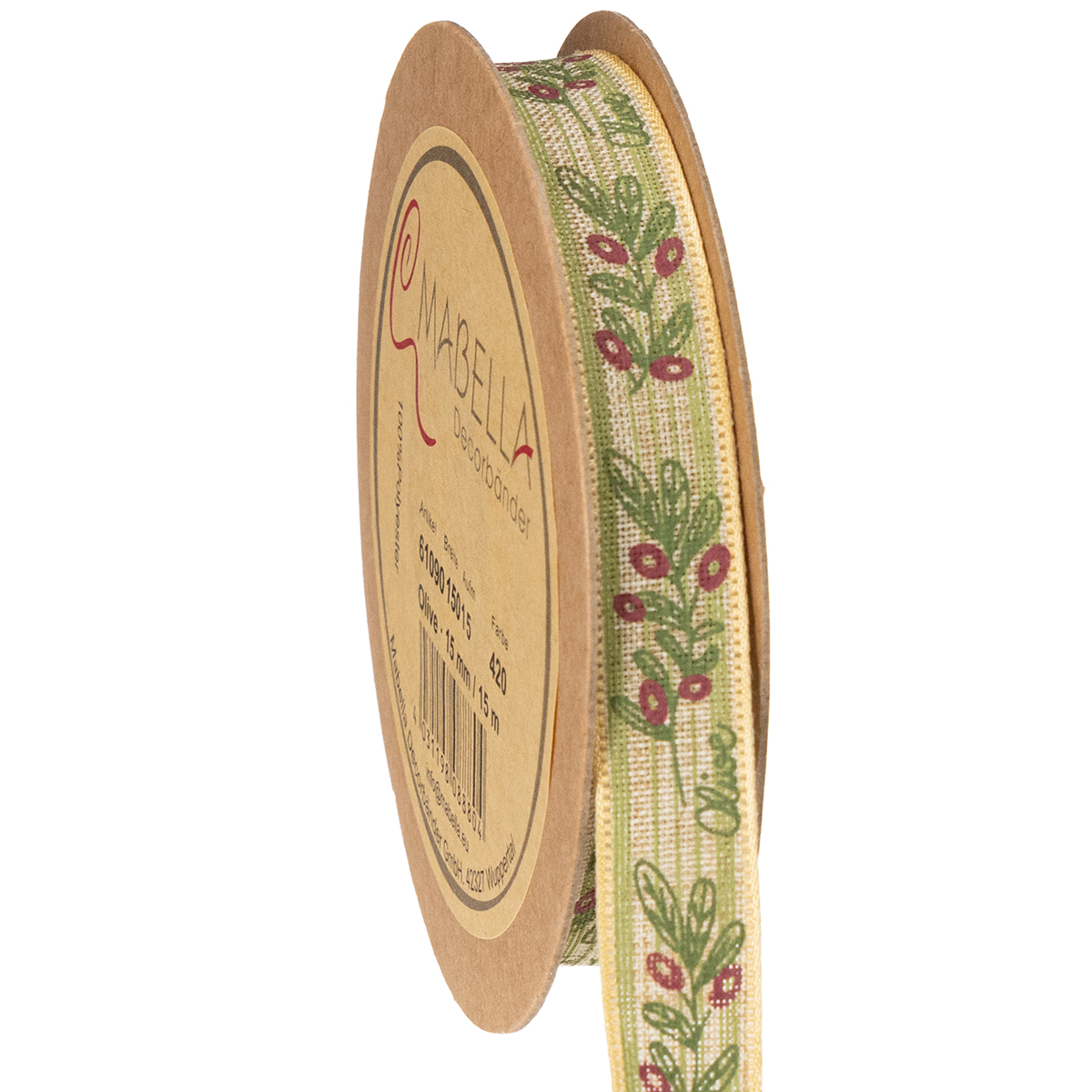 Názov produktu: Darčeková stuha s olivovou ratolesťou a elegantnými vetvičkami a olivami 1,5 cm 15 m