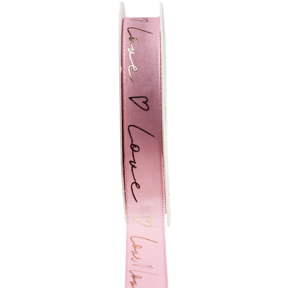 Látková stuha je vyrobená z polyesteru vo veľmi jemnej ružovej farbe a je na nej vytlačené slovo „Love“ a obrysy zlatých srdiečok. Lem zabraňuje rozstrapkaniu ozdobnej stuhy.