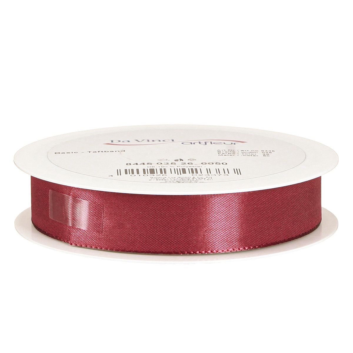 Darčeková stuha zo 100 % polyesteru v bordovej farbe so šírkou približne 25 milimetrov a dĺžkou približne 50 metrov vám bude dodaná na praktickej, plochej plastovej cievke.