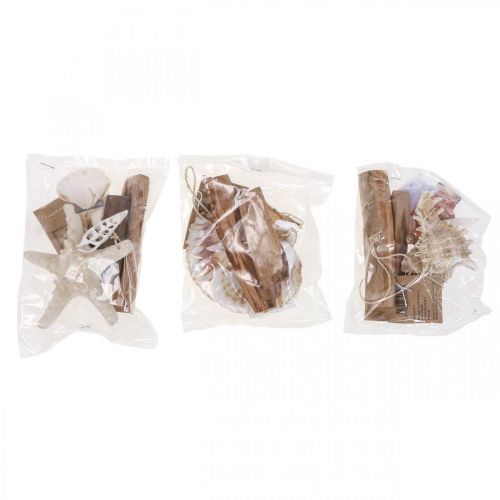 Girlandy z naplaveného dreva s mušľami a morskými hviezdami a lastúrami slimákov sú súborom harmonicky usporiadaných závesných dekorácií.Každý z troch námorných dekoratívnych príveskov pozostáva z dvoch kusov naplaveného dreva zviazaného na šnúre, dvoch ozdobných kotúčov zo slimákov a dvoch malých srdiečok. Vešiaky sa však líšia ústredným dekoratívnym prvkom: veľkou lastúrou, sušenou hviezdicou alebo lastúrou morského slimáka.