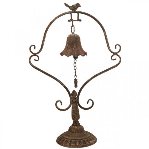 Dekoračný zvonček starožitného vzhľadu je originálna kovová dekorácia pre váš domov. Na vkusný kovový zvonček môžete zazvoniť napríklad vtedy, keď je jedlo pripravené pre vašich blízkych.Zvonček visí na umelo spracovanom kovovom ráme, ktorý stojí na pevnom podstavci. V hornej časti kovovej dekorácie v starožitnom vzhľade tróni malá očarujúca postavička vtáčika.