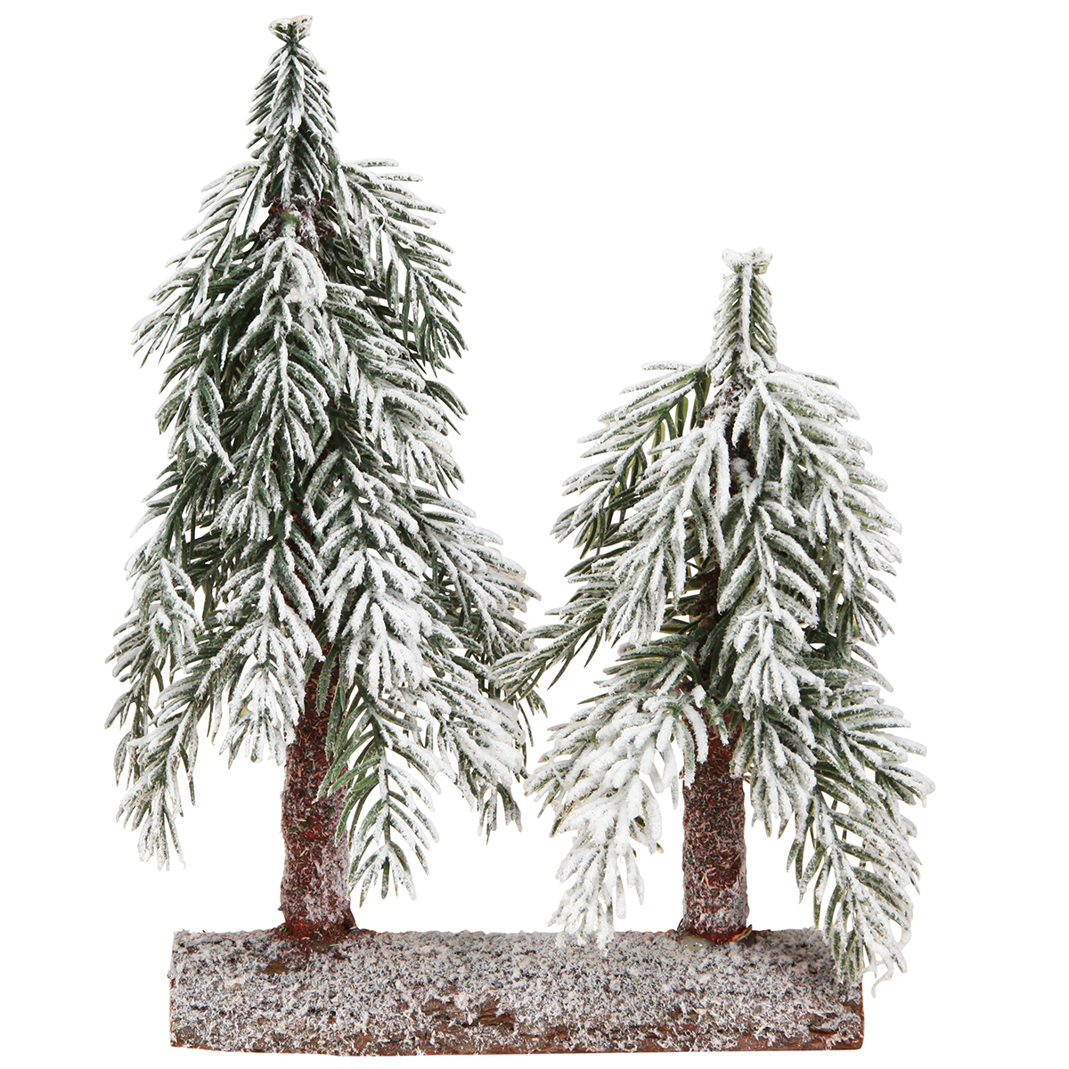 2 malé zasnežené vianočné stromčeky na drevenom podstavci: nutnosť vašej zimnej dekorácie
