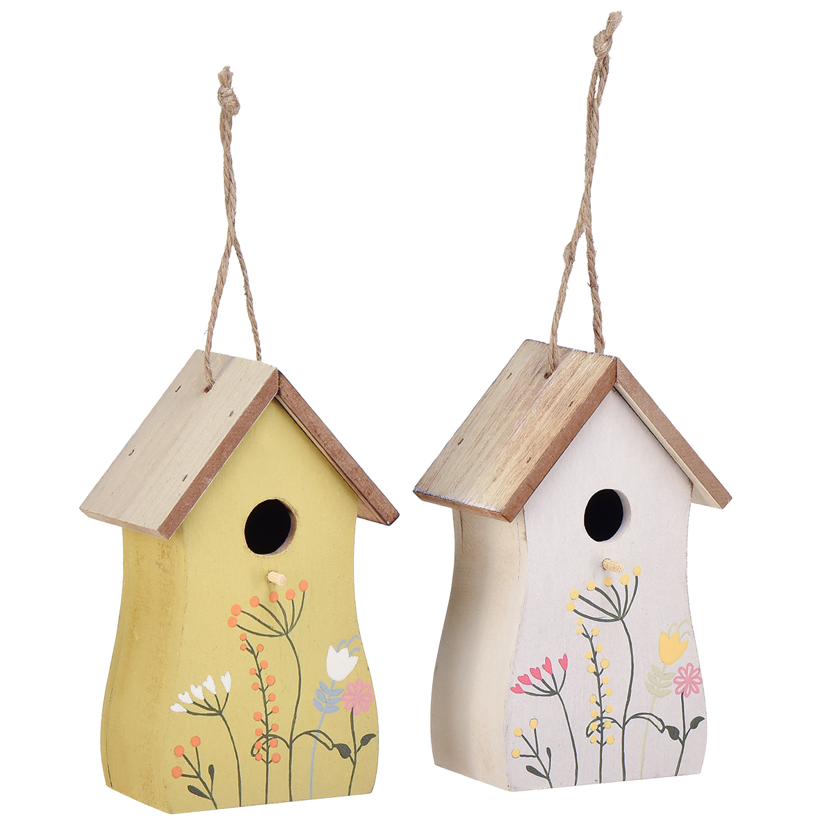 Dekorácia na zavesenie vtáčia búdka drevo biela žltá 13cm 2 ks