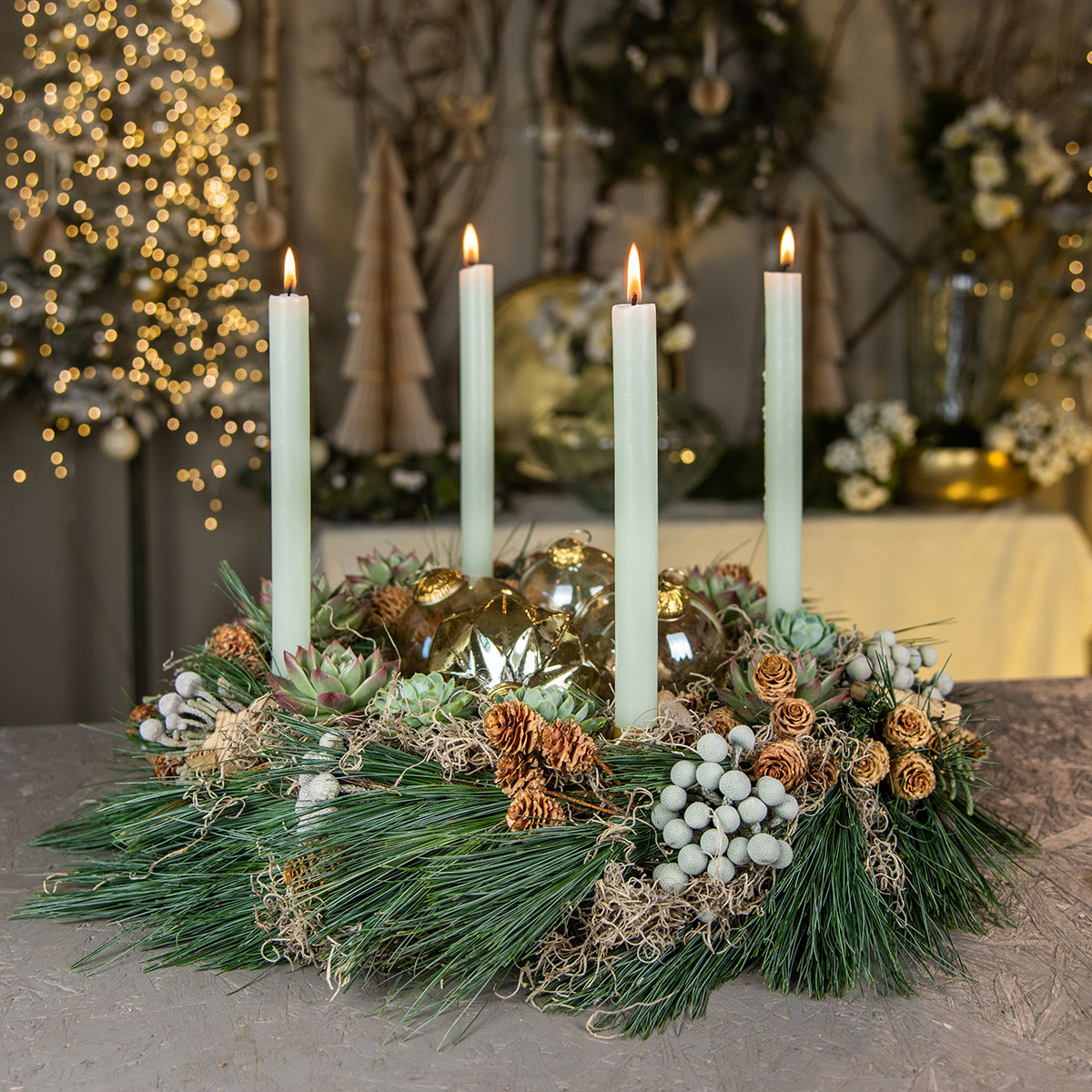 Prírodný hnedý lesný mach dodáva aranžmánom teplú, rustikálnu atmosféru - tiež skvelý nápad na prírodné vianočné ozdoby. Túto špeciálnu machovú dekoráciu nájdete aj v iných prírodných farbách.