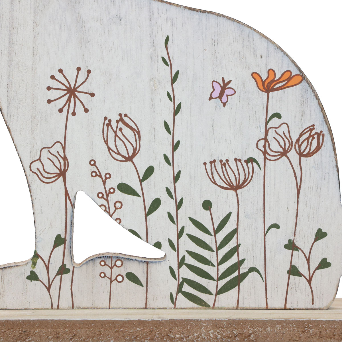 Dekoratívna figúrka je spočiatku nenápadne vybielená, no krásne drevo sa pod ňou stále jasne leskne. Na prednej strane je namaľovaná farebná krajinka a králičia tvár. Zadná strana zostáva biela. Veľkonočný zajačik stabilne sedí na drevenom podstavci.