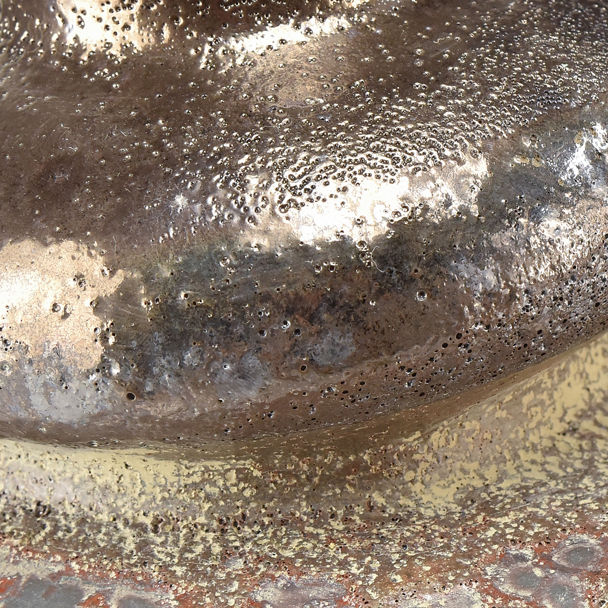 Táto dizajnová váza v metalickom vzhľade meria 19×18×16 cm a prezentuje sa tvarom, ktorý spája prirodzenosť s moderným leskom. Spodnú úroveň charakterizujú vegetatívne, hrdzavo sfarbené vzory na modrosivom podklade, zatiaľ čo horná časť žiari v tmavom, kovovom trblietavom tóne. Táto keramická váza s metalickým efektom premení vašu obývačku, kanceláriu či foyer na miesto štýlovej elegancie a bude pôsobiť moderným dojmom.