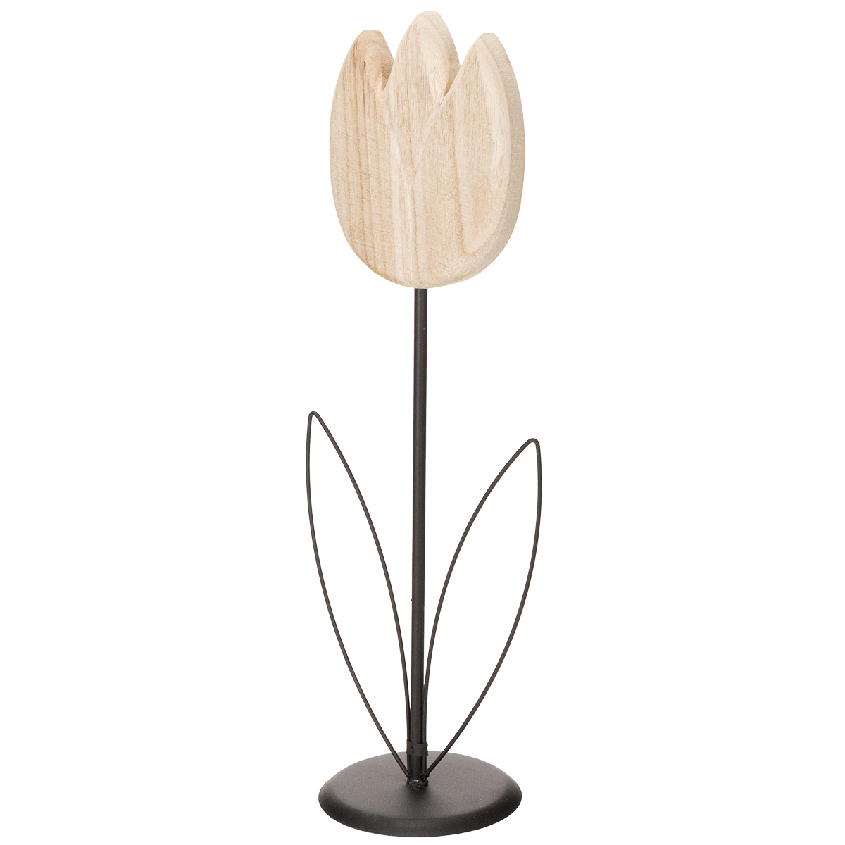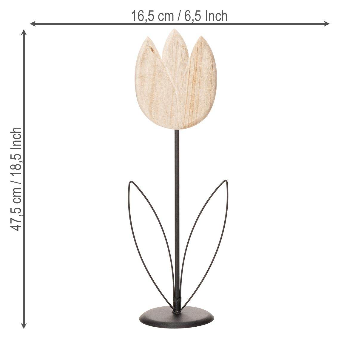 Táto figúrka tulipánu s výškou 47,5 cm je skutočným pútačom pozornosti bez toho, aby bola rušivá. Či už na parapete, ako stredobod obývačky alebo ako elegantný bytový doplnok na chodbe – tento drevený kvet so svojím precíznym remeselným spracovaním zaručene upúta pozornosť. Prírodné drevo tulipánovej hlavičky vyžaruje teplo, zatiaľ čo jemné čierne kovové listy dodávajú figúrke moderný nádych. Skvelá kombinácia prírody a mestskej elegancie.