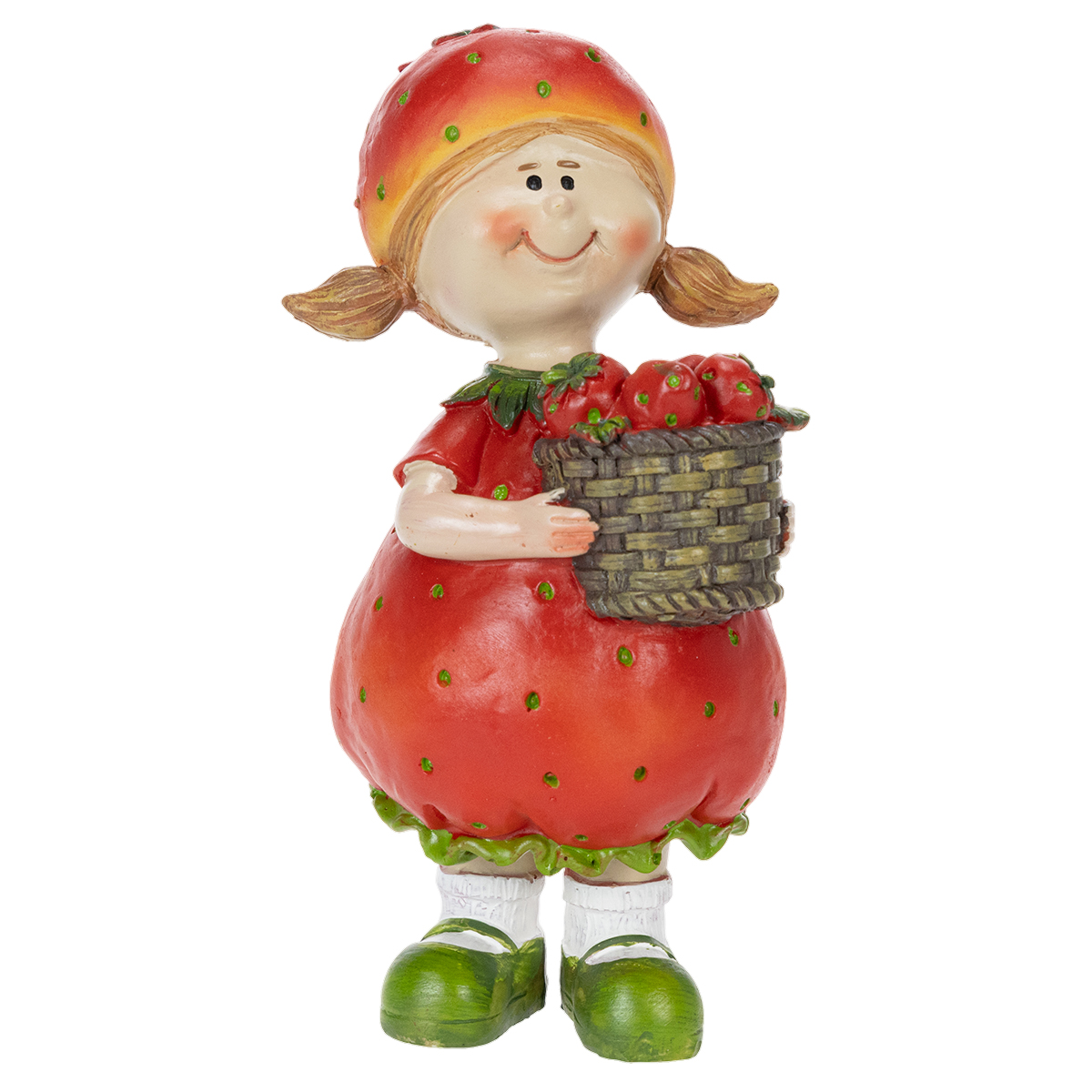 Figúrka Jahodové dievčatko s výškou 18 centimetrov a prepracovanými detailmi je dekoratívna figúrka, ktorá dodá každej miestnosti nádych rozprávkovej mágie. Figúrka v žiarivej červenej a zelenej farbe je ideálna na ozdobenie balkónových kútov plných rastlín, poličiek v obývačke alebo letných párty stolov. Rozkošné jahodové šaty, sladké zapletené vlasy a košík preplnený jahodami vytvárajú harmonický celkový vzhľad.
