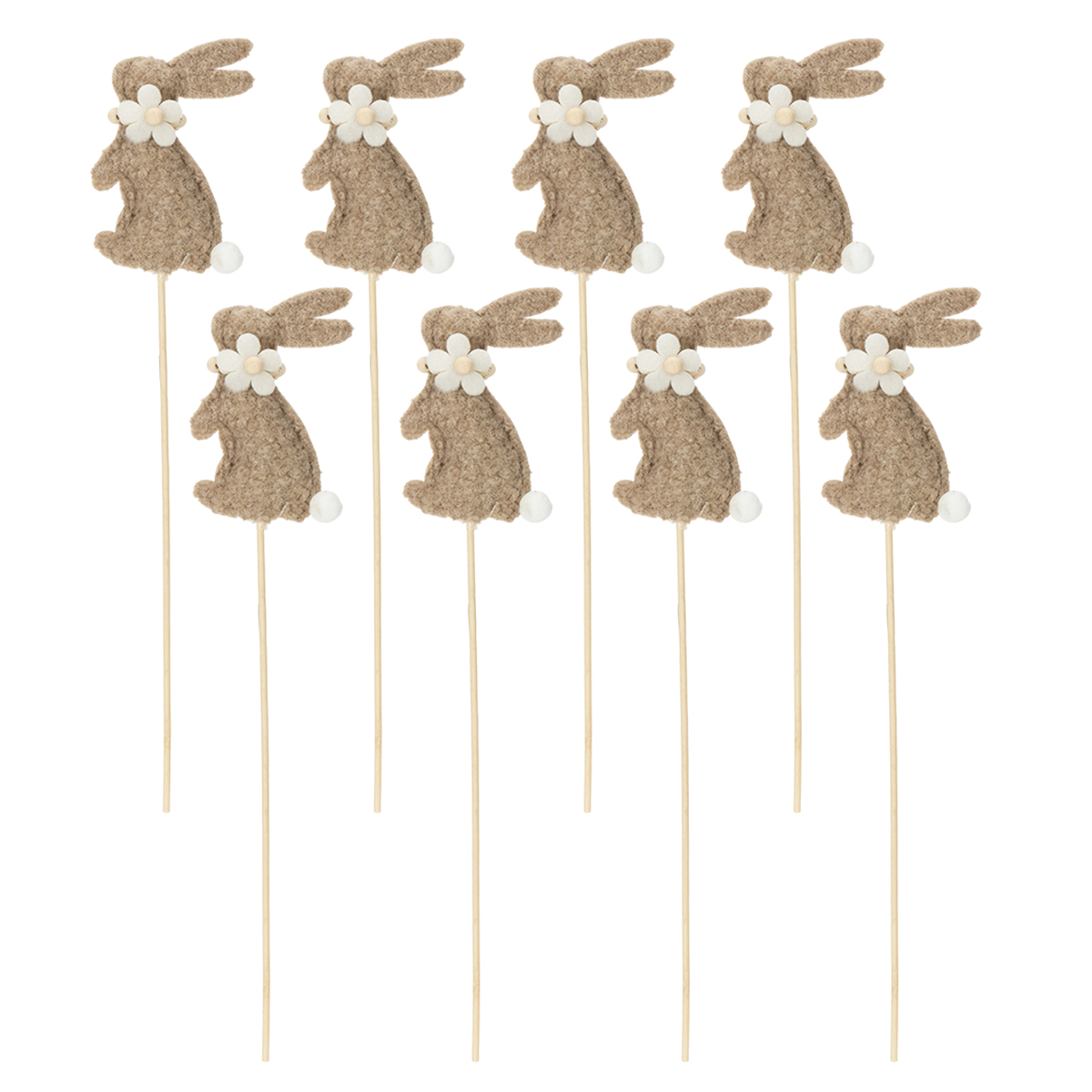 Tieto 42 cm vysoké ozdobné kolíky vyzerajú obzvlášť žiarivo, keď sú zakomponované do jarných aranžmánov. Možno by ste ich mohli skombinovať s čerstvými kvetmi alebo ich umiestniť do prúteného košíka? Zajačiky sú ideálne na použitie v interiéri aj exteriéri. Od dekorácií stola na veľkonočné raňajky až po zdobenie vašich záhradných párty, tieto figúrky sú rovnako všestranné ako samotné ročné obdobie. S ôsmimi dielikmi v balení máte dostatok priestoru na to, aby ste naplno rozvinuli svoje kreatívne nápady.