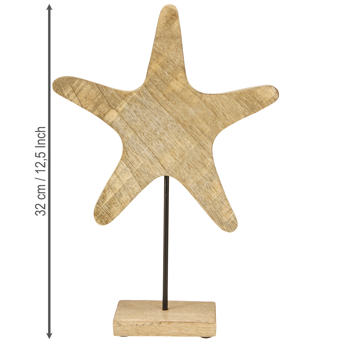 Doprajte svojmu obytnému priestoru nádych mora a letnej sviežosti s našou dekoratívnou hviezdicou na drevenom podstavci v prírodnej a modrej farbe. Tento jedinečný dekoratívny kúsok, ideálny pre milovníkov námorníckeho štýlu, kombinuje prvky prírodných farieb s umeleckým prevedením. Hviezdica je starostlivo vyrobená z vysoko kvalitného mangového dreva a na jednej strane namaľovaná upokojujúcou modrou farbou, ktorá pripomína rozľahlosť oceánu. Postavený na pevnom drevenom podstavci v prírodnej farbe je podopretý elegantnou kovovou tyčou v čiernej farbe - skutočný pútač v každej miestnosti. Táto námorná dekorácia je obzvlášť dobrá ako dekorácia do obývačky alebo ako letná dekorácia na stôl na balkón. Jeho očarujúci dizajn ladí s klasickým aj moderným štýlom interiéru a vnáša do vášho domova pocit dovolenky. Objavte rozmanité možnosti využitia a skombinujte hviezdicu s inými produktmi z nášho sortimentu na Floristik24.