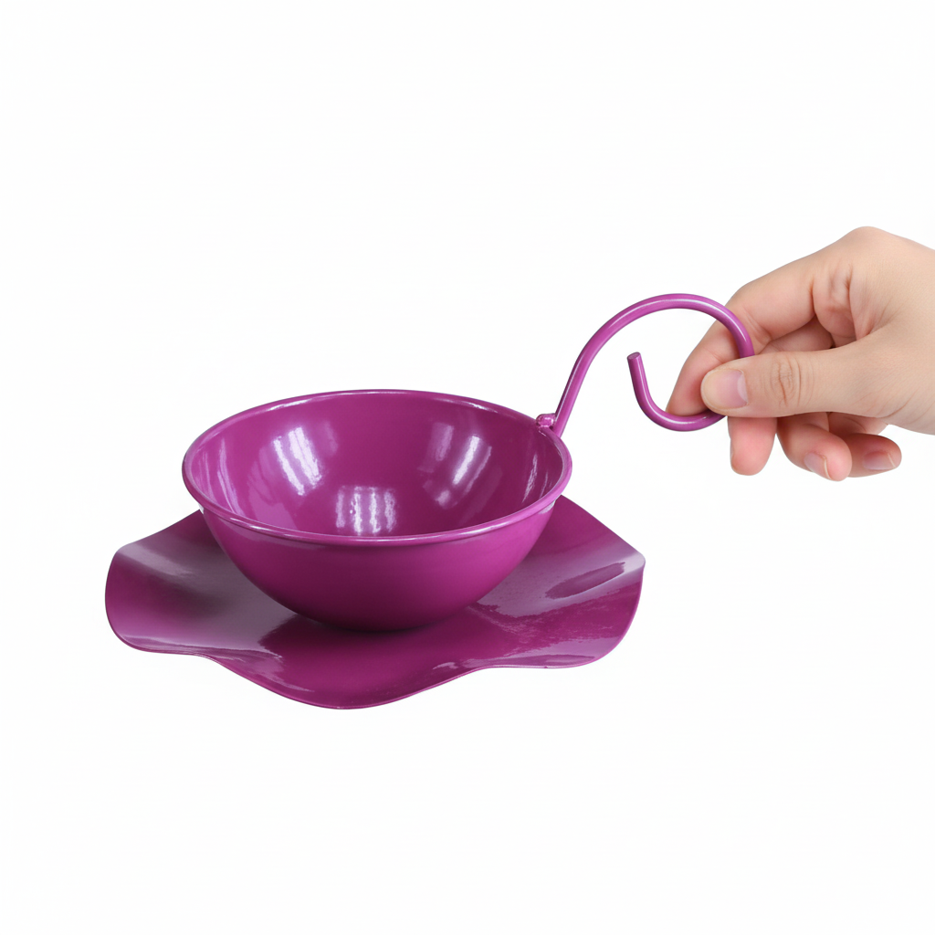 Potešte svoje kvety fialovým kovovým ozdobným pohárom. Táto čajová šálka dodá vašej dekorácii farbu ako kvetinová misa na jar a v lete! S priemerom otvoru okolo 11,5 cm a výškou 8 cm je ideálny na rôzne dekoratívne účely - v interiéri aj v letnej záhrade. Fialová farba vyžaruje tajomnú eleganciu a dokonale ladí s prírodnými pastelovými tónmi alebo výraznými akcentovými farbami, čo otvára množstvo kreatívnych dizajnových možností. Za pozornosť stojí najmä elegantne zakrivená rukoväť a zvlnená podšálka v tvare kvetu pripevnená k šálke, ktorá je nielen vizuálne príťažlivá, ale aj funkčne pôsobivá. Tento fialový lakovaný dekoratívny pohár sa dodáva v súpravách po dvoch a je absolútnou nevyhnutnosťou pre každého, kto chce obohatiť svoje okolie o vkusné akcenty.
