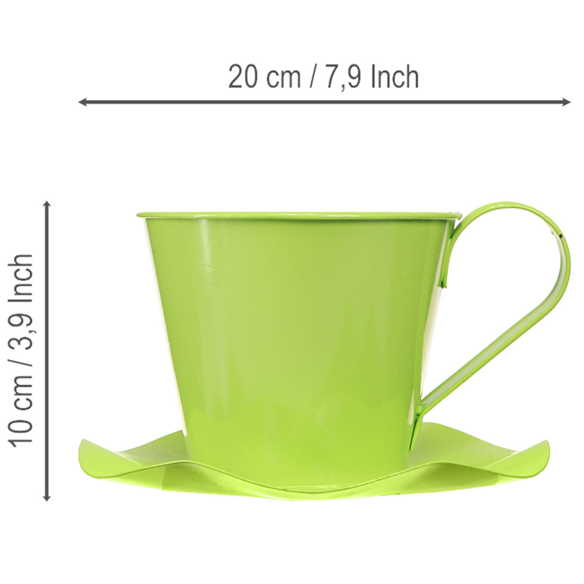 Dodajte svojim izbám svieži a živý akcent s našou ozdobnou kovovou šálkou vo svetlej jablkovo zelenej farbe. Táto dekoratívna čajová šálka kombinuje klasický dizajn s modernými akcentmi a ponúka vám nekonečné možnosti kreatívneho dizajnu. Svetlozelená kovová šálka je upevnená na podšálke v tvare kvetu a zaujme svojim elegantným vzhľadom. S priemerom okolo 12 centimetrov pre šálku a okolo 18 centimetrov pre podšálku a výškou okolo 10 cm je ideálny pre široké spektrum dekoratívnych použití. Či už na odkladanie drobností, ako štýlová dekorácia na stôl pri zvláštnych príležitostiach alebo ako mini kvetináč pre vaše obľúbené rastliny – možnosti využitia sú rozmanité. Objavte radosť z dekorácie s touto očarujúcou kovovou šálkou na čaj, ktorá dodá každému miestu osobitý nádych.