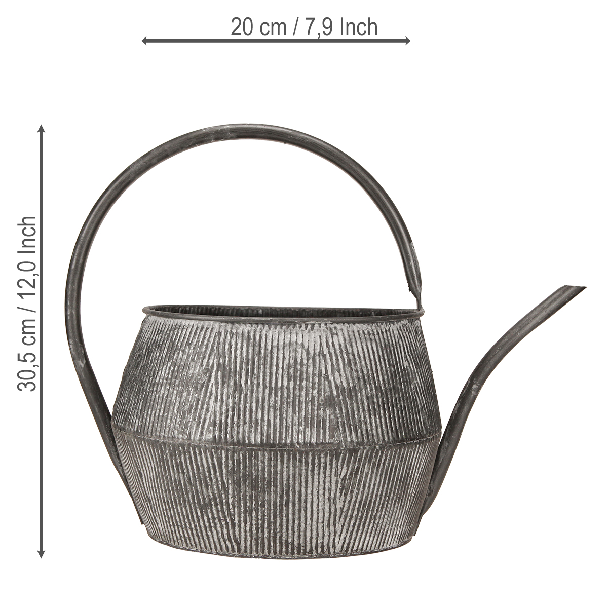 Vitajte vo svete pôvabných dekorácií, ktoré spájajú štýl s funkčnosťou. Dekoratívna kanva z čierneho kovu je nielen pútačom, ale aj nadčasovým dekoratívnym kúskom, ktorý bude bodom porozprávania v každej miestnosti. Tento kúsok, inšpirovaný tvarom tradičnej čajovej kanvice alebo nostalgickej kanvice, spája eleganciu zašlých čias s moderným nádychom. Čierny kov je jemne praný do sivej a skvele sa hodí do retro, vintage alebo aj minimalistických štýlov interiéru. Zálievka s pôsobivými rozmermi približne 39 cm × 25 cm × 30,5 cm ponúka veľkorysý priestor, ktorý poslúži ako štýlový kvetináč alebo kovový kvetináč. Pri priamej výsadbe sa odporúča ozdobnú zálievku v štýle čajníka vystlať výsadbovou fóliou a opatriť ju drenážnou vrstvou, ktorá zabezpečí optimálnu starostlivosť o rastliny. Použite tento kúsok ako dekoráciu na balkón alebo ako súčasť vašej vintage dekorácie pre harmonickú atmosféru v interiéri aj exteriéri.
