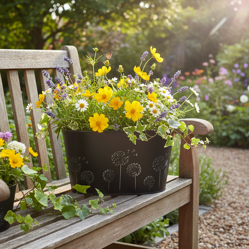 Štýlový vzor s púpavami nájdete aj na iných kovových kvetináčoch a ozdobných nádobách.