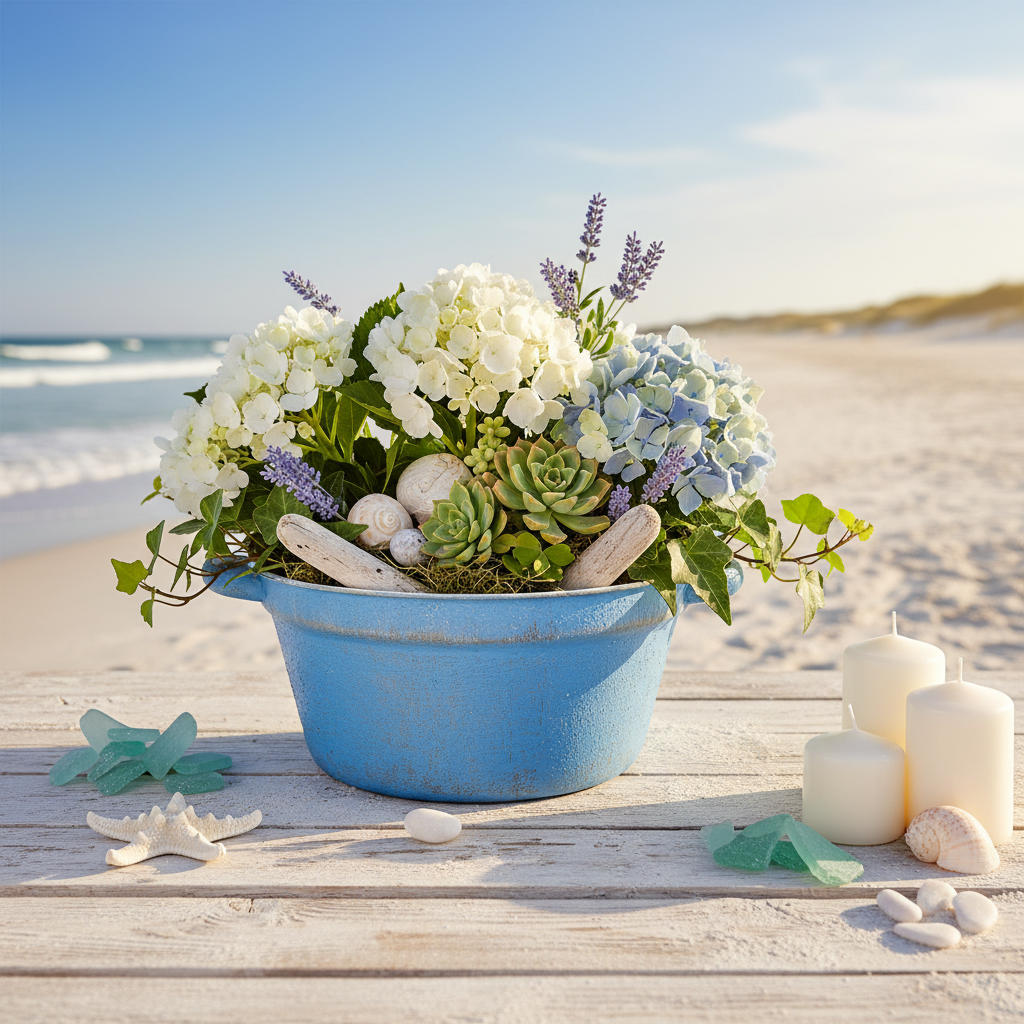 Kovová dekorácia vyzerá krásne aj s ozdobnými kameňmi alebo pieskom a sukulentmi. Vďaka farebnej schéme sa kvetináč perfektne hodí do každej námornej dekorácie. Ozdobte misku pieskom, sušenými kvetmi, mušľami a naplaveným drevom. Takto sa kovový cachepot stáva harmonickou dekoráciou stola.