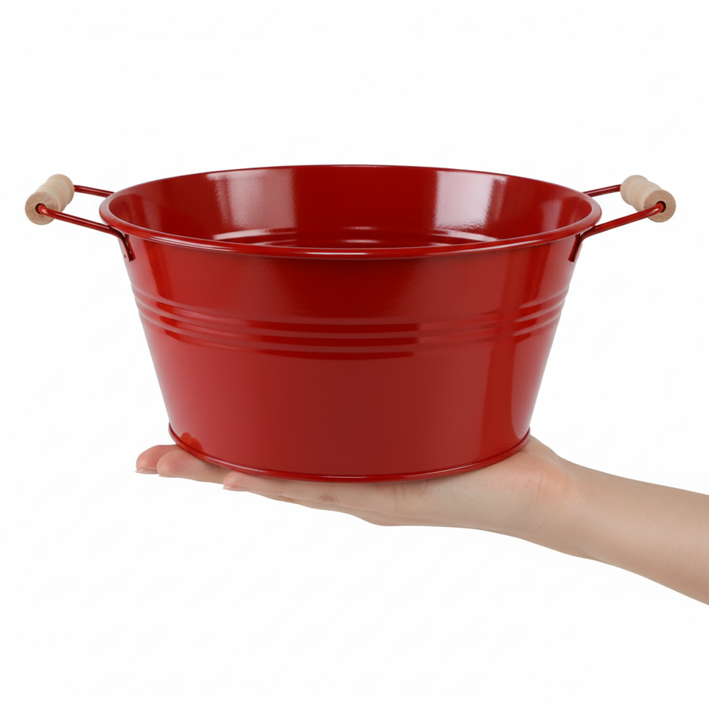 Táto kvetinová misa žiari v tej najkrajšej červenej. Klasický tvar dotvárajú rúčky s pravými drevenými rúčkami. Kovová dekorácia pôsobí harmonicky a nostalgicky.