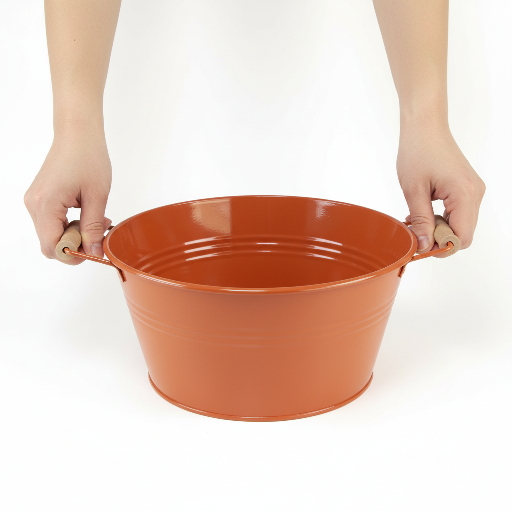 Sýto červenú verziu ozdobnej misky s rúčkami a kovovými vedierkami v tomto prevedení nájdete aj v našom obchode. Skombinujte niekoľko rastlín v tejto kovovej dekorácii a vytvorte štýlový jarný súbor.