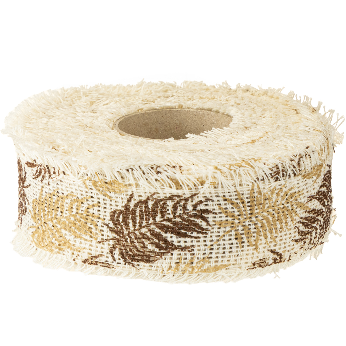 Jemná bavlna krémovej farby tejto látkovej stuhy je zdobená pierkovými lístkami, ktoré tvoria vzor v hnedej a béžovej farbe. So strapcami pôsobí mriežkovaná stuha krásne ležérne a vnáša do vašich dekorácií uvoľnenú, prirodzenú atmosféru.