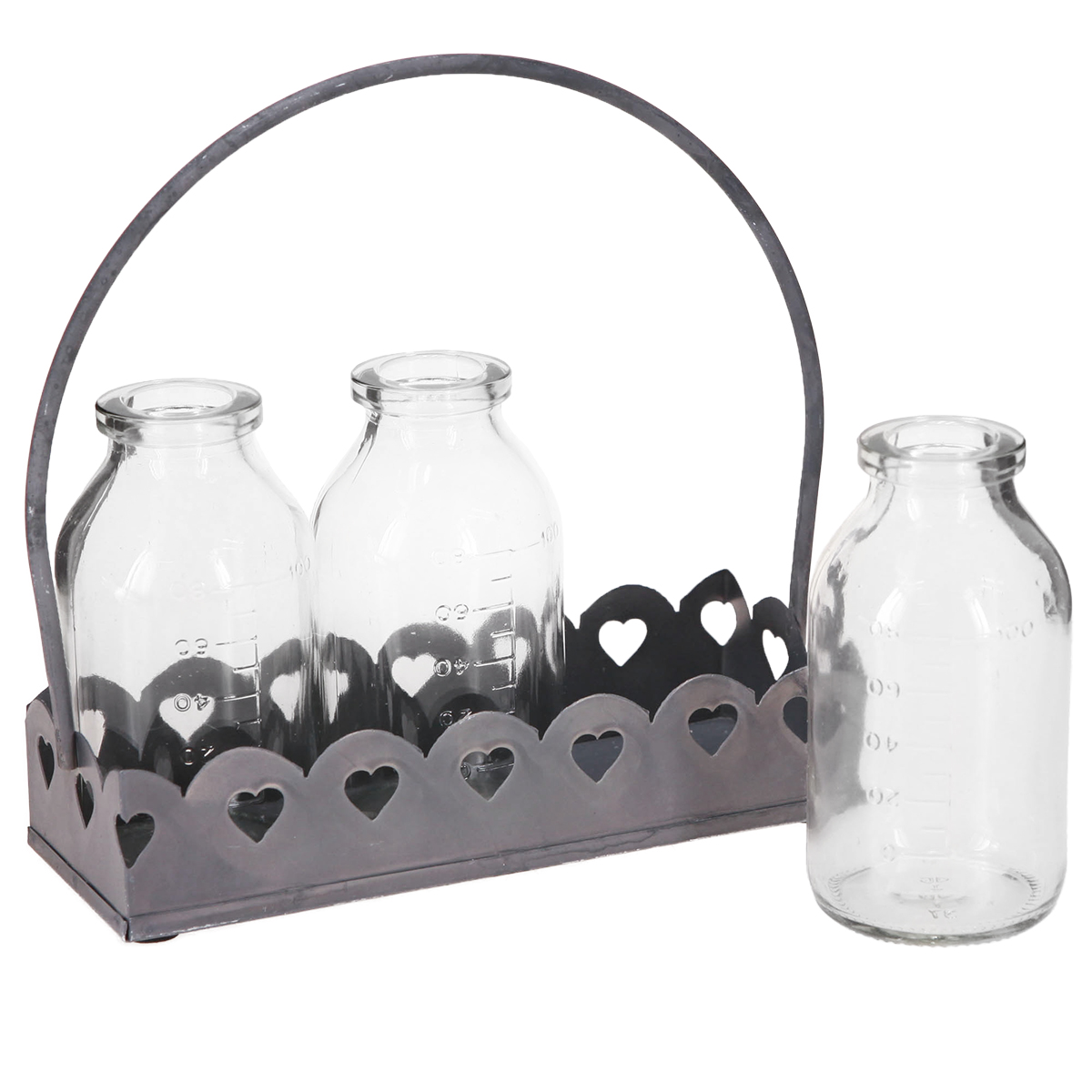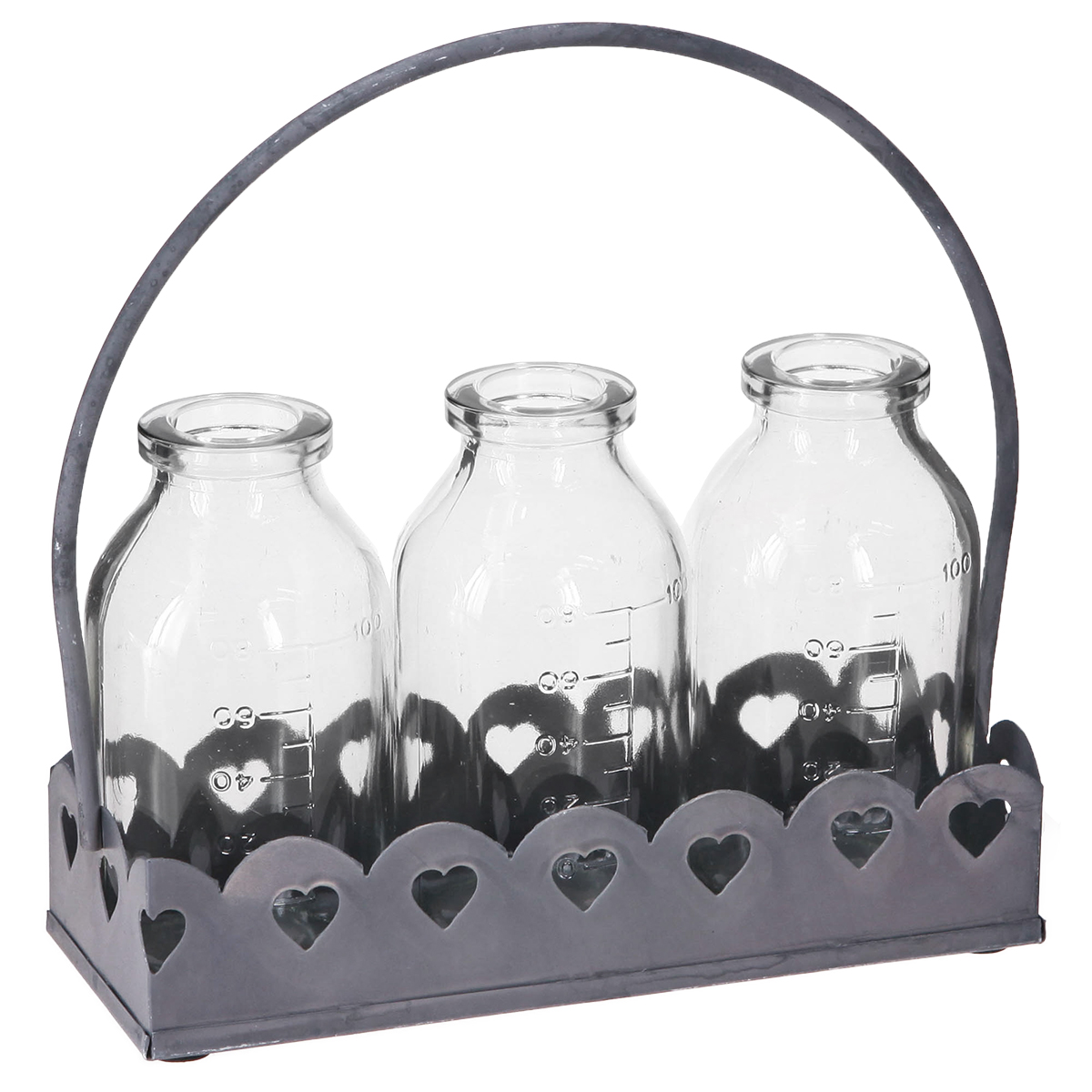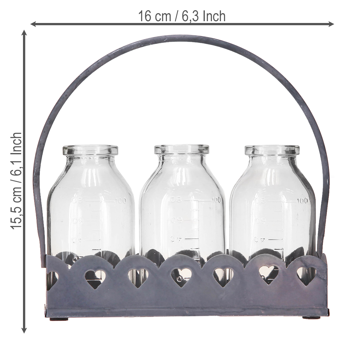 Zažite magickú príťažlivosť dekorácií mini fliaš ako váz na podnose. Tieto očarujúce dekoratívne fľaše sú ideálne na dodanie nostalgie do vášho obytného priestoru. Každá z troch sklenených váz pripomína starožitné lekárnické fľaše a je umiestnená na pevnom sivom kovovom podnose s vyrazenými motívmi srdca. Tento detail v retro štýle dodáva aranžmánu romantický nádych, vďaka čomu je ideálny na svadobnú výzdobu, útulnú dekoráciu stola alebo ako tip na darček. Rozmery na fľašiach otvárajú rôzne možnosti využitia, od rýchleho vysádzania malých kvetinových aranžmánov až po skladovanie byliniek alebo remeselných materiálov.