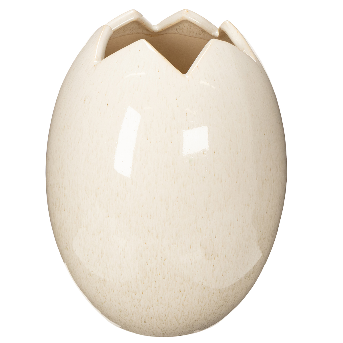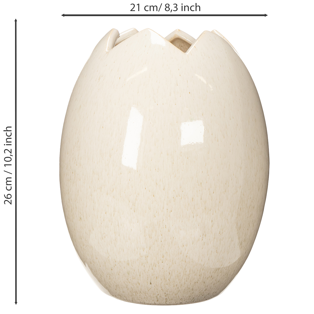 Táto dekoratívna váza v tvare vajca kombinuje moderný dizajn s všestrannou funkčnosťou. Vďaka svojim rozmerom (výška 26 cm, priemer 21 cm) a vysoko kvalitnému keramickému materiálu sa bez problémov začlení do rôznych obytných priestorov. Jej elegantná škvrnitá biela povrchová úprava vyžaruje decentnú eleganciu, ktorá nikdy nie je rušivá. Efekt popraskanej „škrupiny“ na hornom okraji z nej robí skutočný pútač pozornosti.