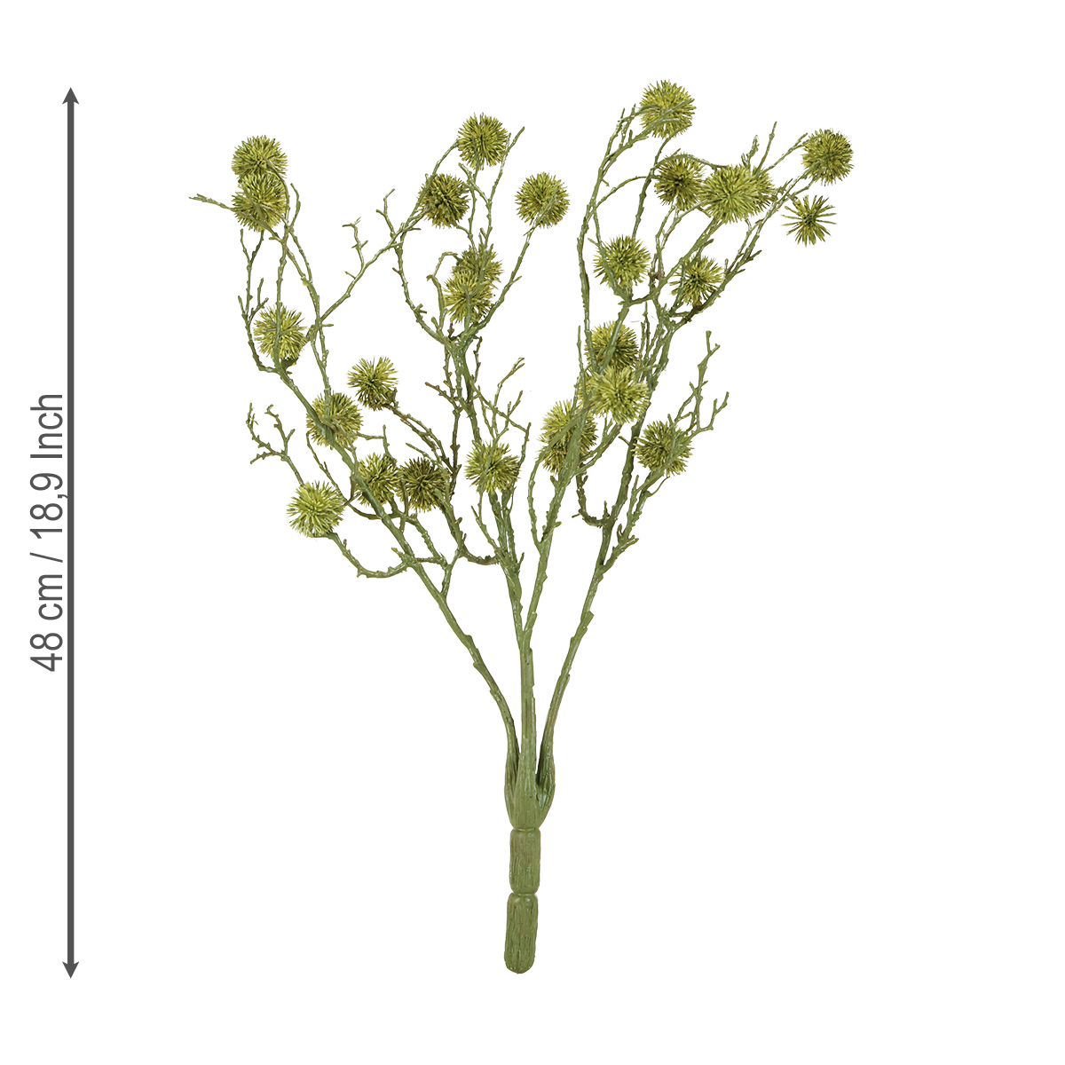 Naša dekoratívna vetvička nie je len obyčajná zelená vetvička – je to umelecké dielo inšpirované prírodou. Vetvička s celkovo 28 bobuľami ambrózie pôsobí nádherne žiarivo a prináša krásu prírody priamo do vášho domova. Tí, ktorí uprednostňujú modernejší vzhľad, si zamilujú štýlovú kombináciu sviežej zelene a prirodzeného tvaru. Pevná, hrubá stonka sa rozvetvuje do štyroch rôznych vetiev, čo zabezpečuje, že vetvička si zachová svoj tvar aj v prepracovanejších aranžmánoch. Vďaka flexibilným drôtom v stonkách je možné umelú vetvičku ohýbať a tvarovať podľa potreby – či už ako súčasť umeleckej dekorácie stola, do venca na dvere alebo dokonca ako pútavú dekoráciu na stenu. S nádychom vidieckeho štýlu sa krásne hodí do každého typu interiéru. Aranžujte ju s niekoľkými svetlozelenými vetvičkami z našej kolekcie alebo ju skombinujte s našimi hodvábnymi kvetmi v jemných pastelových odtieňoch a vaša dekorácia bude absolútnym pútačom pozornosti.