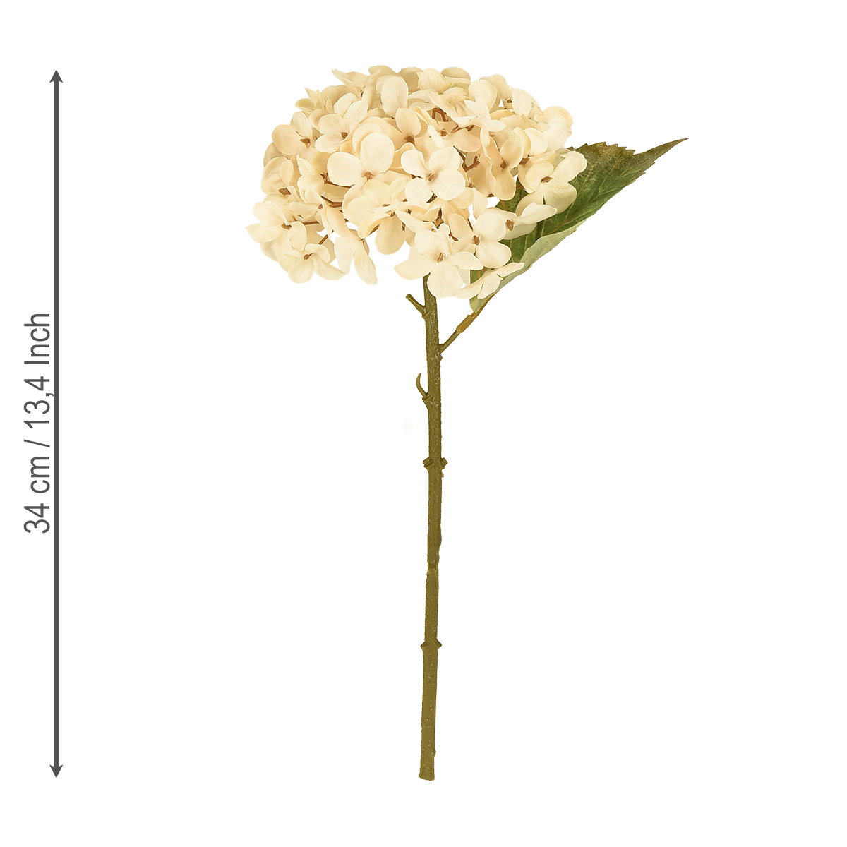 Tieto krémovo sfarbené umelé hortenzie sú perfektnou kvetinovou dekoráciou na leto a jeseň! Tieto mimoriadne realistické hodvábne kvety s výškou približne 34 cm a elegantnou krémovou farbou sa bez problémov začlenia do každej miestnosti. Táto umelá replika hortenzie (latinsky: Hydrangea ) odráža krásu mierne vysušeného kvetu koncom leta a dodá vášmu domovu romantický, nostalgický nádych. Kvety sú vyrobené z vysoko kvalitného hodvábu a sedia na pevnej, no zároveň ohybnej stonke s kovovým jadrom, ktoré je možné tvarovať podľa vašich predstáv. Krémovo sfarbené kvety so zelenými listami vyzerajú klamlivo reálne a určite potešia fanúšikov bytových doplnkov v štýle shabby chic. Tieto hodvábne hortenzie sú ideálne na decentné aranžmány stolov, dlhotrvajúce jesenné dekorácie a inšpiratívne DIY projekty.