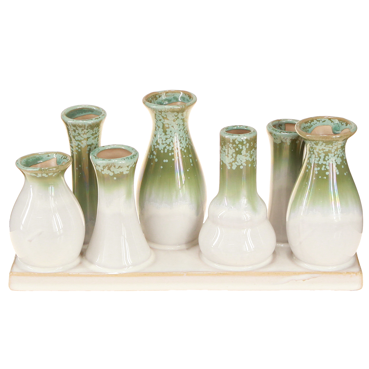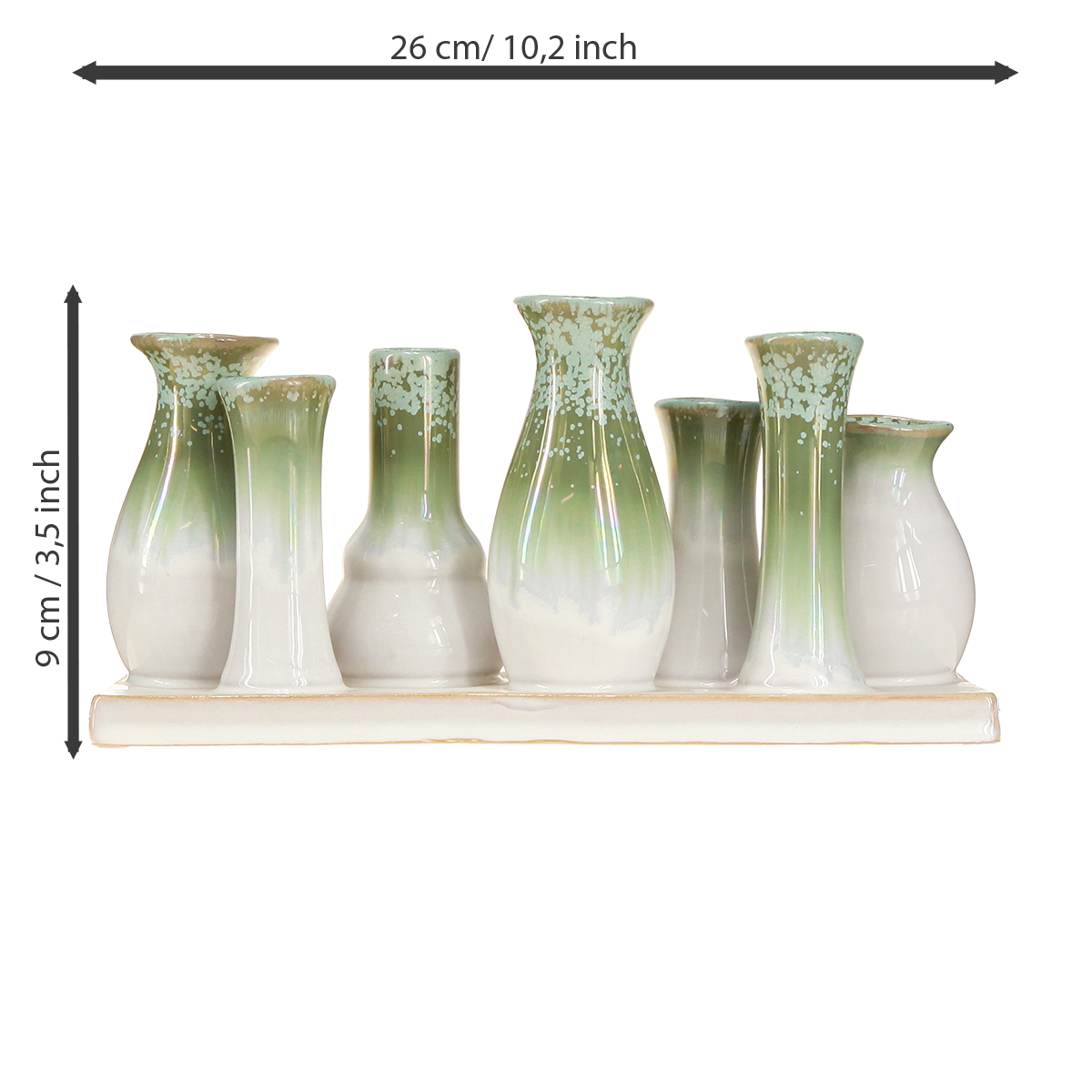 Táto sada siedmich malých dekoratívnych keramických váz na farebne zladenom podnose sa rýchlo stane vrcholom vášho interiéru. Harmonické zelené a biele tóny evokujú prirodzenosť škandinávskeho dizajnu a dokonale dopĺňajú minimalistický alebo rustikálny štýl. Vázy majú rôzne tvary, čo krémovej farbe dodáva vizuálnu zaujímavosť. Či už sú usporiadané ako skupina alebo jednotlivo, táto sada ponúka nespočetné množstvo dizajnových možností.