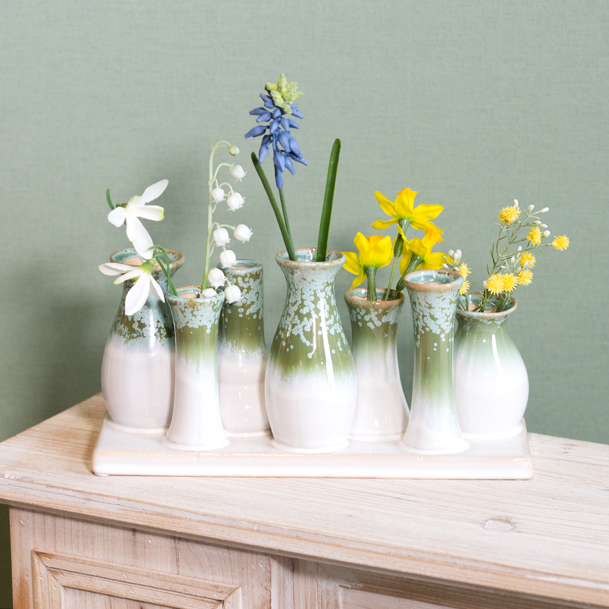 Táto sada siedmich malých dekoratívnych keramických váz na farebne zladenom podnose sa rýchlo stane vrcholom vášho interiéru. Harmonické zelené a biele tóny evokujú prirodzenosť škandinávskeho dizajnu a dokonale dopĺňajú minimalistický alebo rustikálny štýl. Vázy majú rôzne tvary, čo krémovej farbe dodáva vizuálnu zaujímavosť. Či už sú usporiadané ako skupina alebo jednotlivo, táto sada ponúka nespočetné množstvo dizajnových možností.