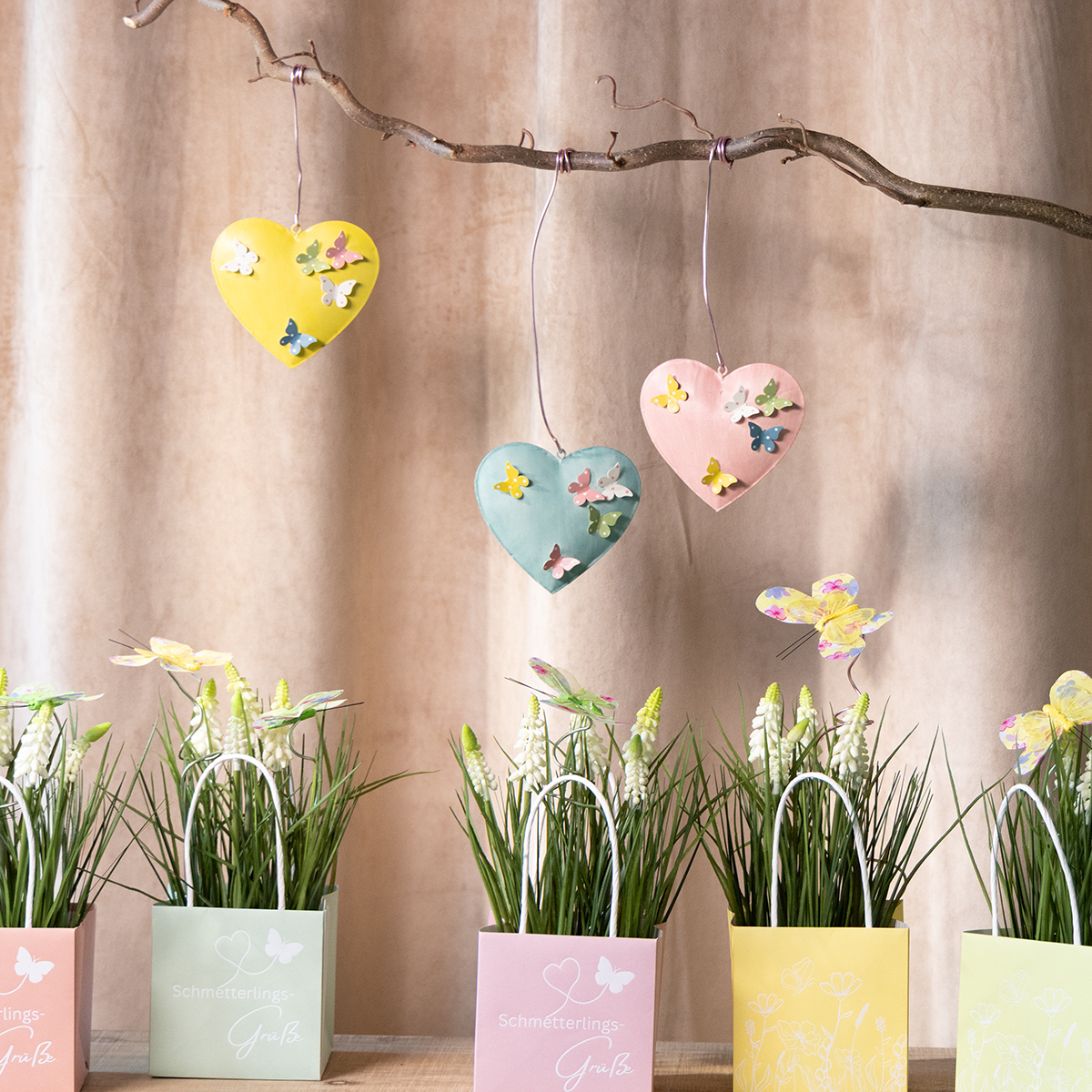 Dekoratívne prívesky v tvare srdca s motýlikmi na jarnú dekoráciu, 10,5 cm, 3 kusy