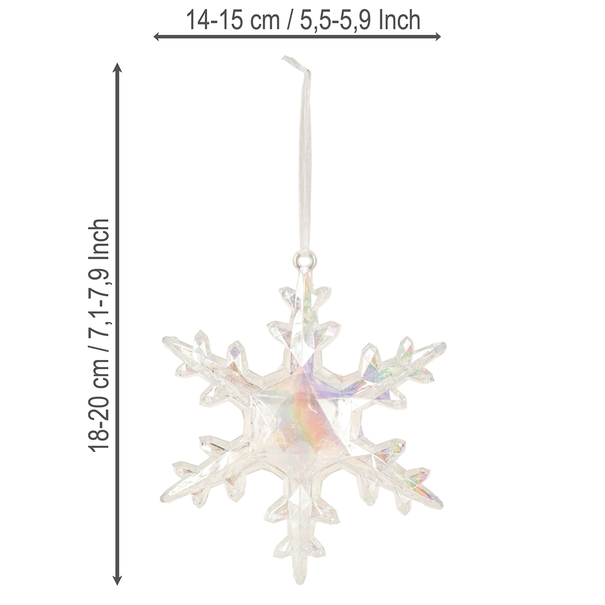 Zažite kúzlo zimy s našimi dúhovými ozdobnými snehovými vločkami. Tieto umne navrhnuté snehové vločky s priemerom 14-15 cm sú dokonalým prvkom, ktorý dodá vášmu obytnému priestoru elegantnú a zimnú atmosféru. Či už ako závesná vianočná dekorácia, ako trblietavá dekorácia na okno alebo ako ozdoba vášho vianočného stromčeka – táto vločková dekorácia zaručene upúta pozornosť každého. Trblietavé povrchy odrážajú svetlo a dodávajú vašej dekorácii očarujúci nádych. Sú vyrobené z vysoko kvalitného plastu, sú pevné a odolné, takže si ich užijete veľa zím.