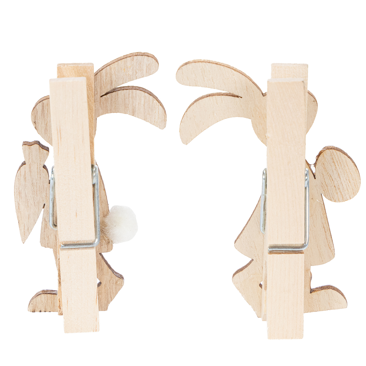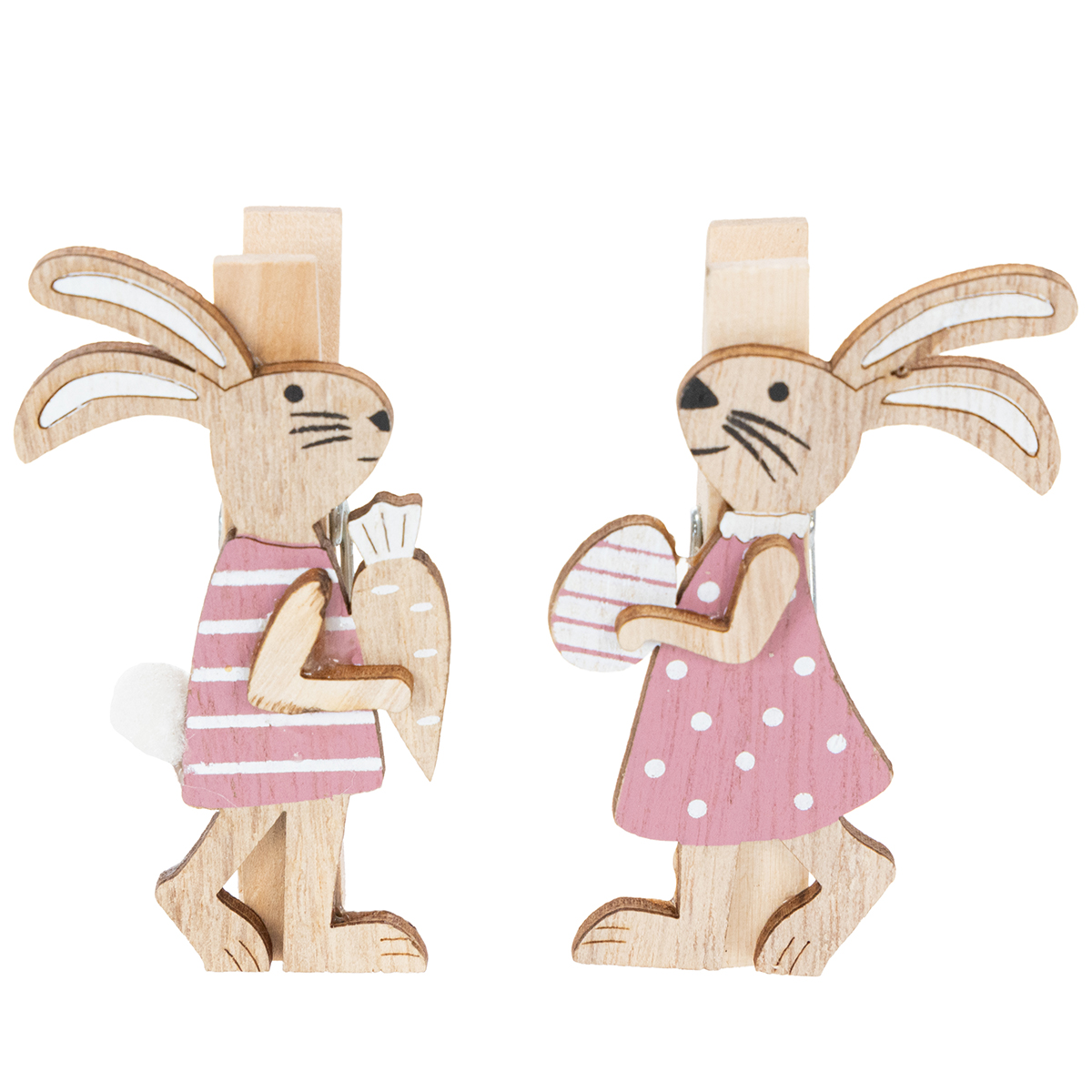 Malé ozdobné drevené sponky ako zajačiky sú dostupné v 4 kusoch: dvaja chlapci a dve dievčatá. Každá dekoračná spona je vysoká približne 7,5 cm.
