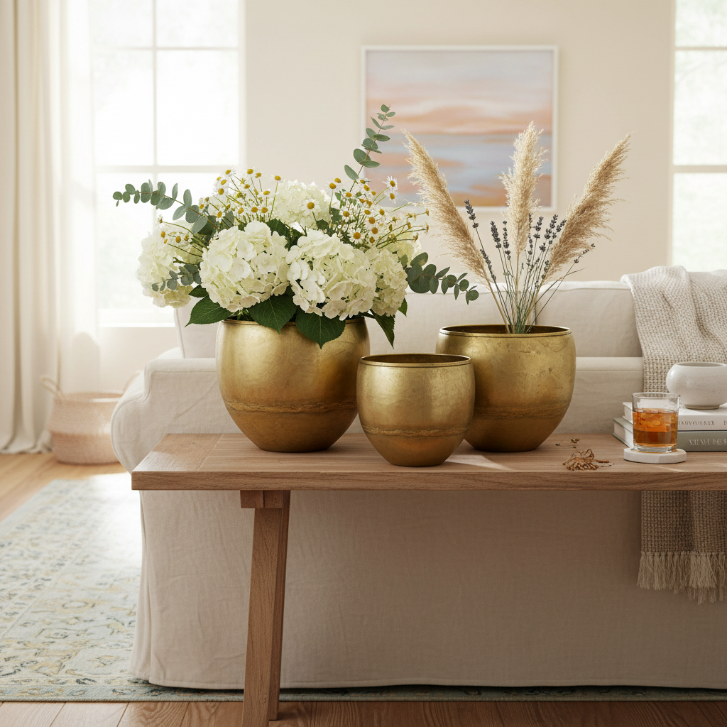 Dekoratívne vázy s mosadzným vzhľadom, kovové vázy Ø18/15/12,5 cm, sada 3 kusov