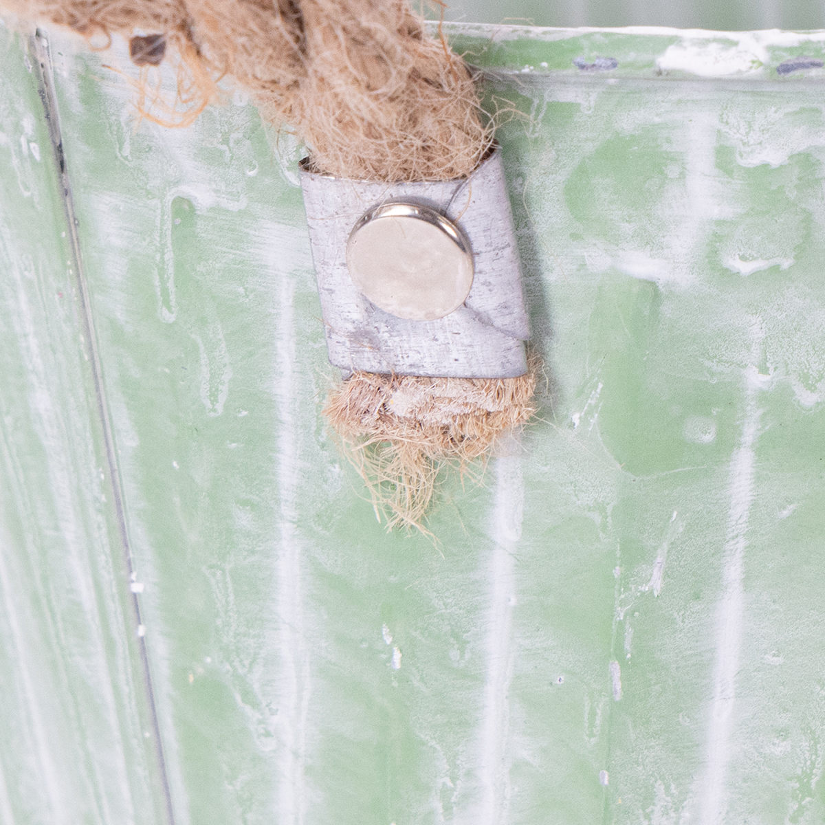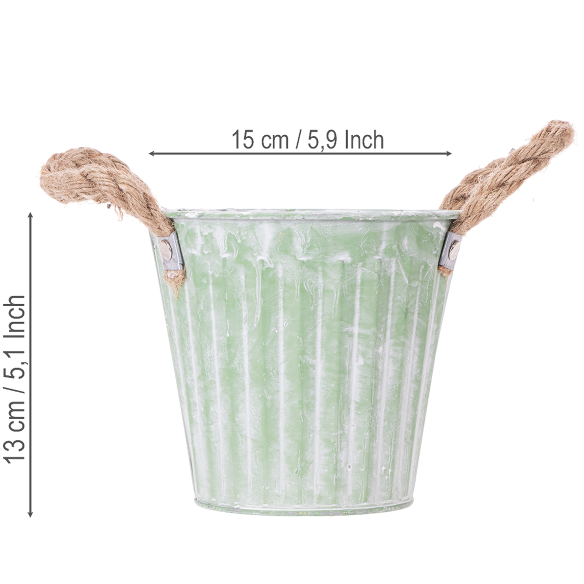 Kvetináč je vybavený rúčkami z jutovej šnúry a je natretý bielou farbou. Miska na pestovanie je tiež po celom obvode zdobená reliéfnym, jednotným vzorom zvislých pruhov. Natretie bielou farbou kvetináčov vytvára krásny kontrast k pastelovým ružovým, zeleným a žltým základným tónom kovových nádob, vďaka čomu vzor kovovej dekorácie ešte viac vynikne!