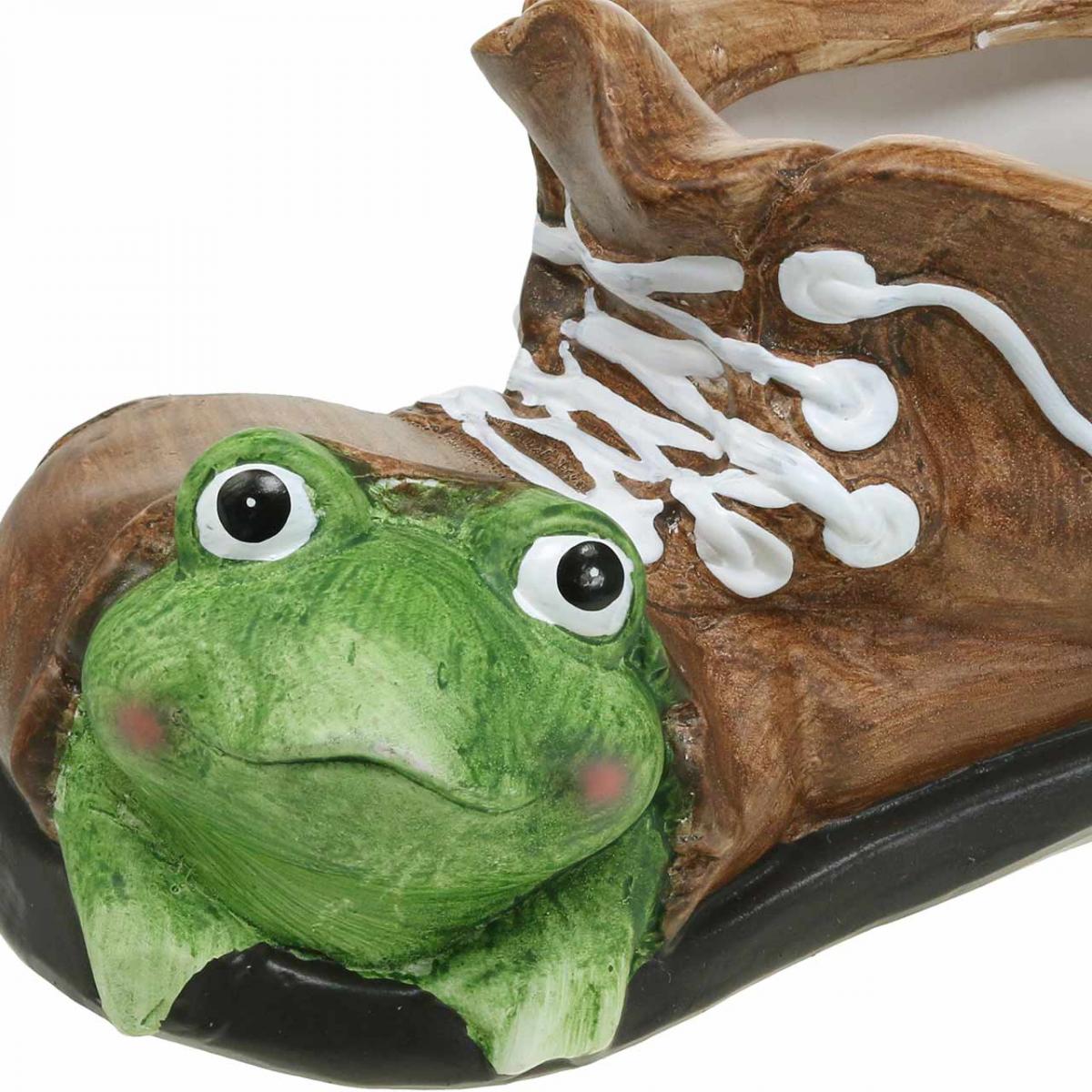 Široká keramická topánka má svetlohnedú farbu, biele šnúrky a tmavohnedú podrážku. V prednej časti sa z otvoru pozerá zelená žabka ako ozdobná figúrka s roztomilými gýčovitými očkami a prstami sa drží podrážky topánky.