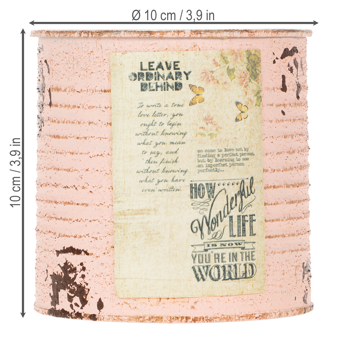 Kvetináč vyrobený z ozdobnej plechovky v pastelovej lososovej farbe pôsobí minimálne ako pravá vintage plechovka. Letná dekorácia z kovu má však rozhodujúcu výhodu v tom, že tu nie sú žiadne ostré hrany. Plechovku tak môžete osadiť bez rizika poranenia. Spod brúsenej pastelovej farby na drážkach plechovky vystupuje hrdzavohnedý odtieň. Navyše maľované hrdzavé škvrny a nostalgický štítok zdôrazňujú ošúchaný chic retro plechovky. Vnútro dekoračného hrnca je vedené veľmi jednoducho v striebornej farbe.