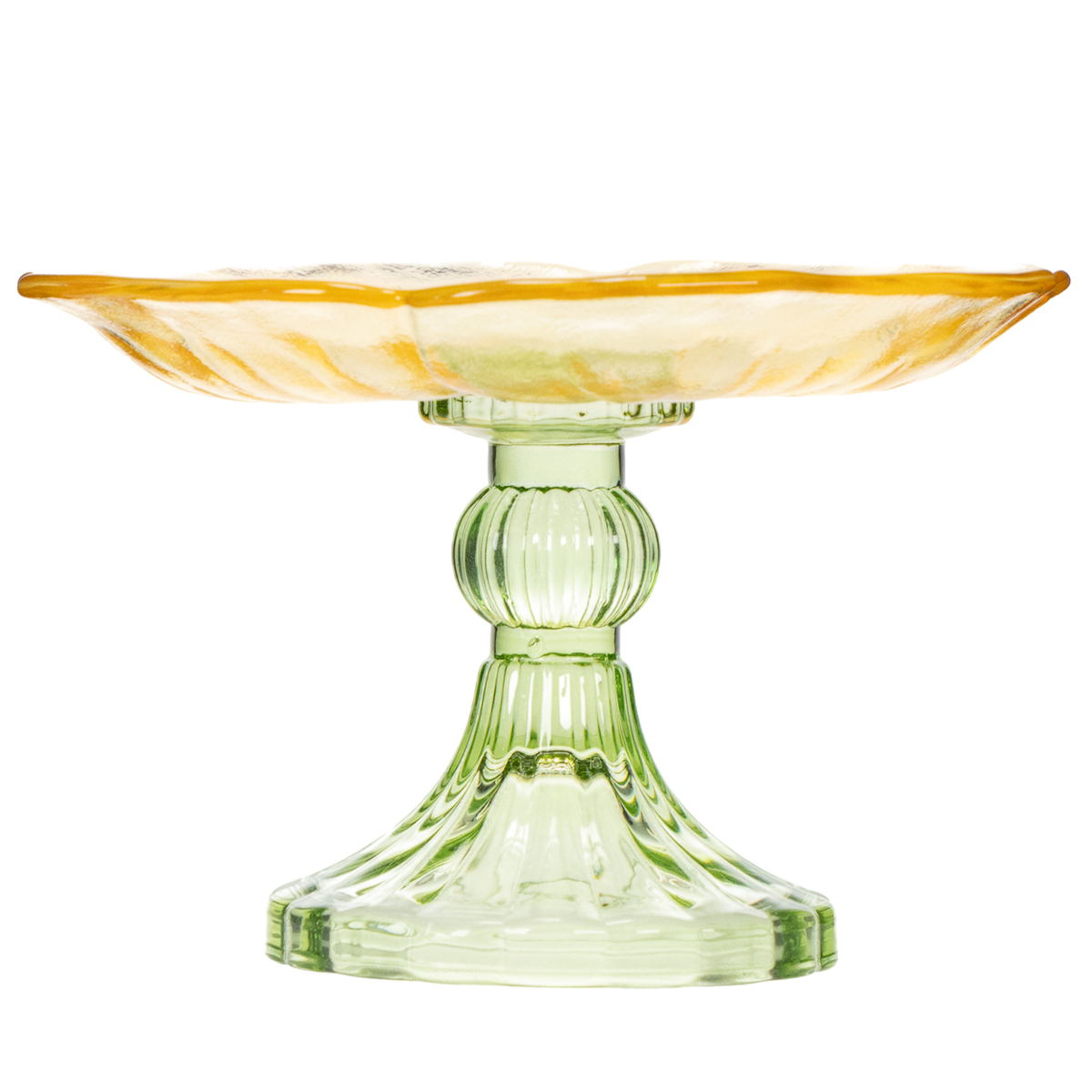 Tento krásny slávnostný sklenený dekoratívny tanier s podstavcom na nohe je skutočným pútačom pozornosti vďaka svojmu jemnému kvetinovému vzoru. Zelený, číry sklenený podstavec elegantne zvýrazňuje jemné žlté kvety a dodáva tanieru ľahký a vzdušný vzhľad. Použite ho na štýlovú prezentáciu jemne zabalených sladkostí, malých koláčikov alebo pečiva. Vďaka svojmu nadčasovému dizajnu sa hodí do moderného aj rustikálneho prostredia. Ideálny na špeciálne príležitosti, ako sú svadby, Veľká noc alebo narodeniny – alebo jednoducho ako ozdoba vášho každodenného prestierania.